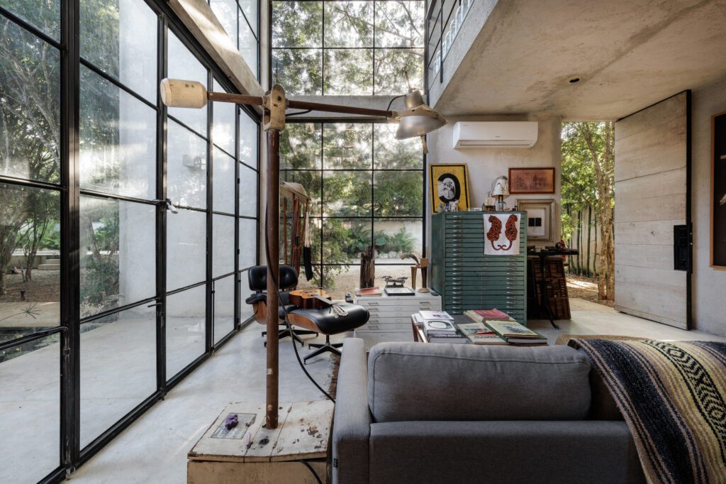 Um espelho d’água com uma árvore no centro traz frescor e um ambiente de calmaria. Em seu interior, o estúdio se organiza como um lugar de resguardo para objetos de coleção, peças que nutrem a inspiração artística e narrativa. O espaço também permite o descanso e a meditação, com uma estrutura flexível que se adapta tanto a momentos de relaxamento quanto à atividade criativa.