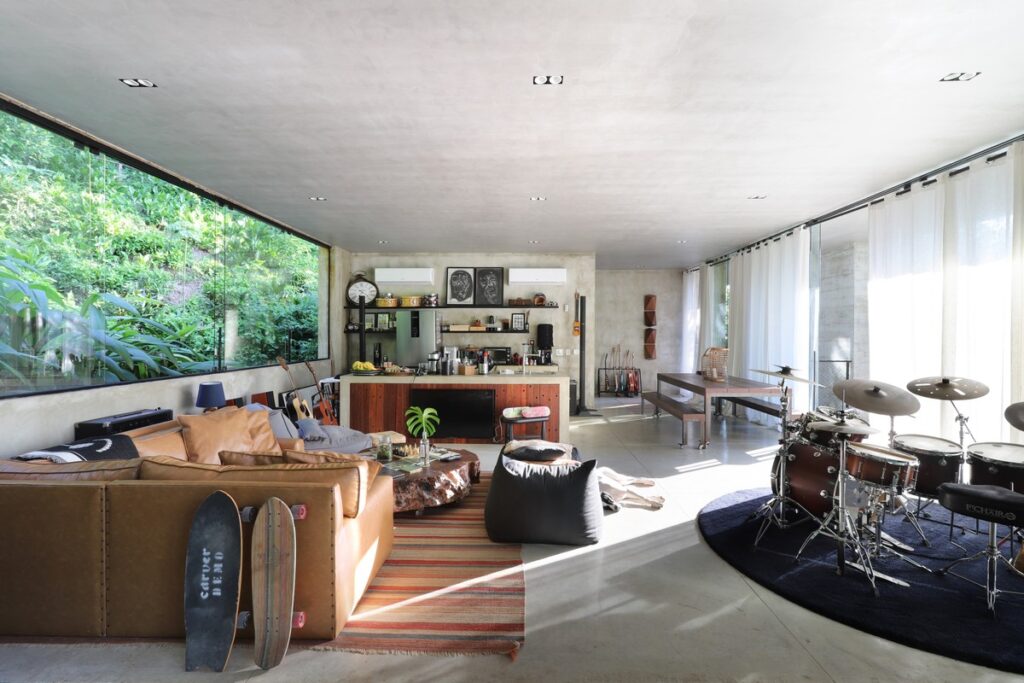 O refúgio do ator e músico Dudu Azevedo nasce entre o concreto, o vidro e a mata, no bairro do Itanhangá, no Rio de Janeiro, pelas mãos de Zanini de Zanine e Pedro Coimbra. Inserida em um terreno de 5 mil m², a morada de 500 m² repousa sobre dois taludes naturais. “O conceito era fazer uma casa concreta, pé no chão, mas completamente aberta para a natureza”, conta Dudu. “Queria ocupar um espaço já livre, causando o mínimo impacto possível e interagindo ao máximo com a vegetação ao redor.” É ali, ao som de artistas como Gilberto Gil, Pink Floyd, Novos Baianos e Led Zeppelin, que ele vive com o filho e seus cinco cachorros: Peteleco, Gaia, Gipsy, Mafalda e Cali.