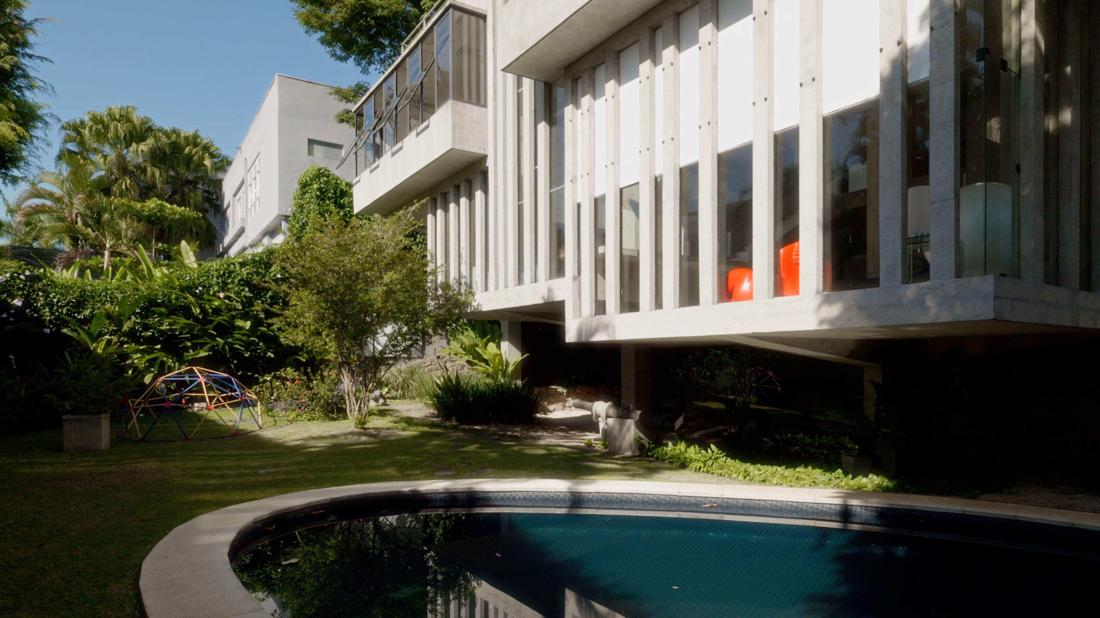 A casa ocupa o lote com notável sobriedade. Estruturalmente resolvida com apenas seis apoios, repousa parcialmente suspensa, criando um gesto de leveza que se acentua no volume da sala de estar, flutuando sobre a piscina. Essa suspensão não é efeito, mas consequência direta do partido adotado — uma solução engenhosa que organiza os espaços de forma coesa e funcional, enquanto produz uma espacialidade generosa e inesperada.