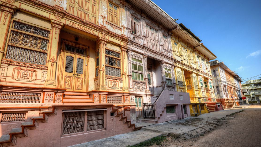 Os nomes das casas, como Mansão Zainab e Solar Kagalwala, frequentemente fazem referência às pessoas que ali viveram. Há destaques, como a casa Zaveri (também conhecida como a Casa com 365 Janelas), que agora está manchada de preto pela sujeira, com suas grandiosas pilastras e entalhes geométricos na fachada precisando urgentemente de restauração, e a Teen Khuniya (ou Casa de Três Cantos), com seu distintivo layout triangular.