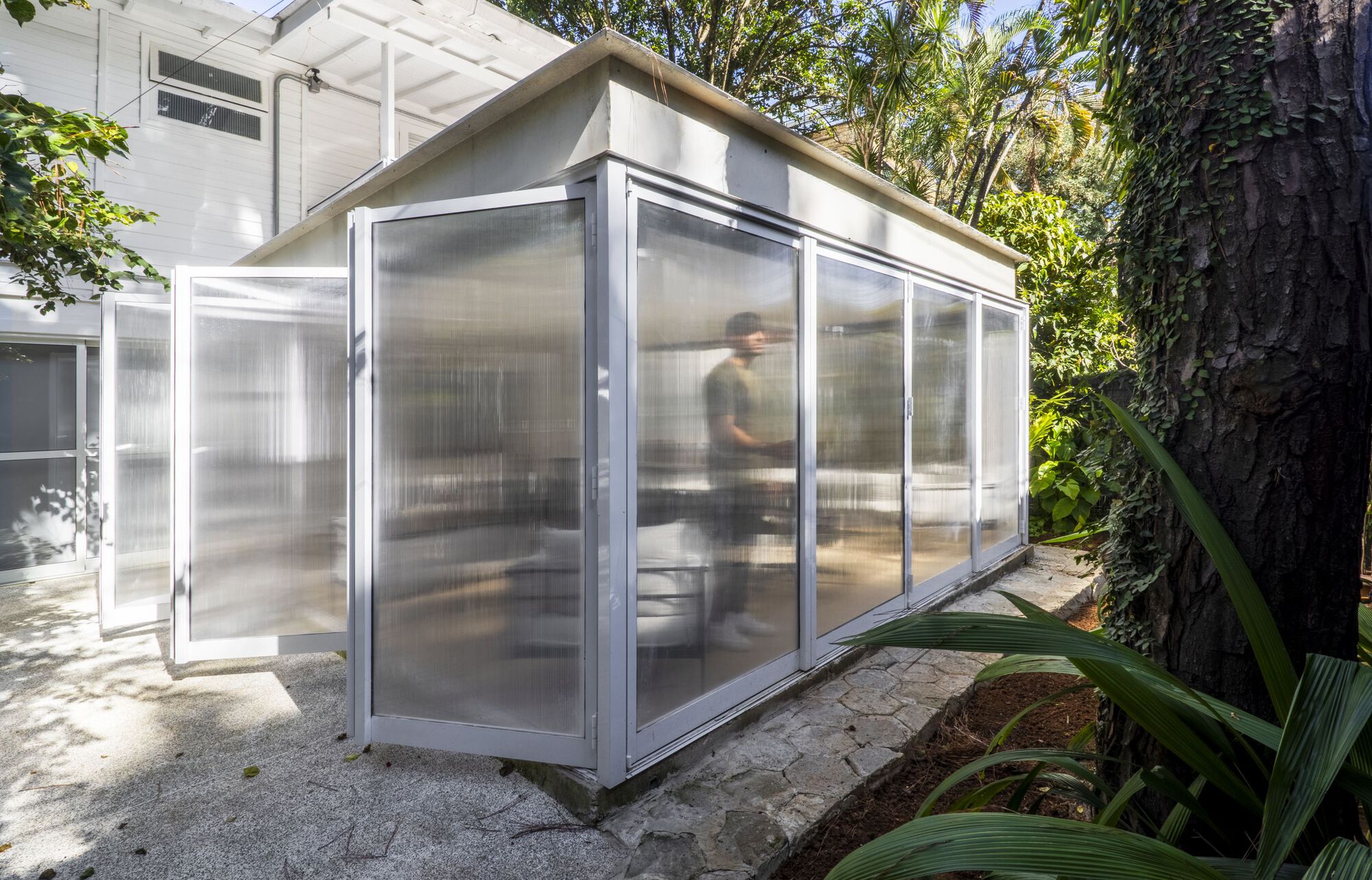 Descrição enviada pela equipe de projeto. Instalado em meio a uma vegetação densa e madura, este projeto corporativo privilegia a integração com a natureza e o uso de materiais leves, propondo uma arquitetura funcional e ao mesmo tempo acolhedora. A edificação, com estrutura branca e cobertura inclinada aparente, abriga uma série de ambientes interligados por caminhos externos e internos que dissolvem os limites entre o dentro e o fora. A envoltória em painéis de policarbonato alveolar translúcido garante privacidade, ao mesmo tempo em que permite a entrada abundante de luz natural, criando interiores suaves e agradáveis.