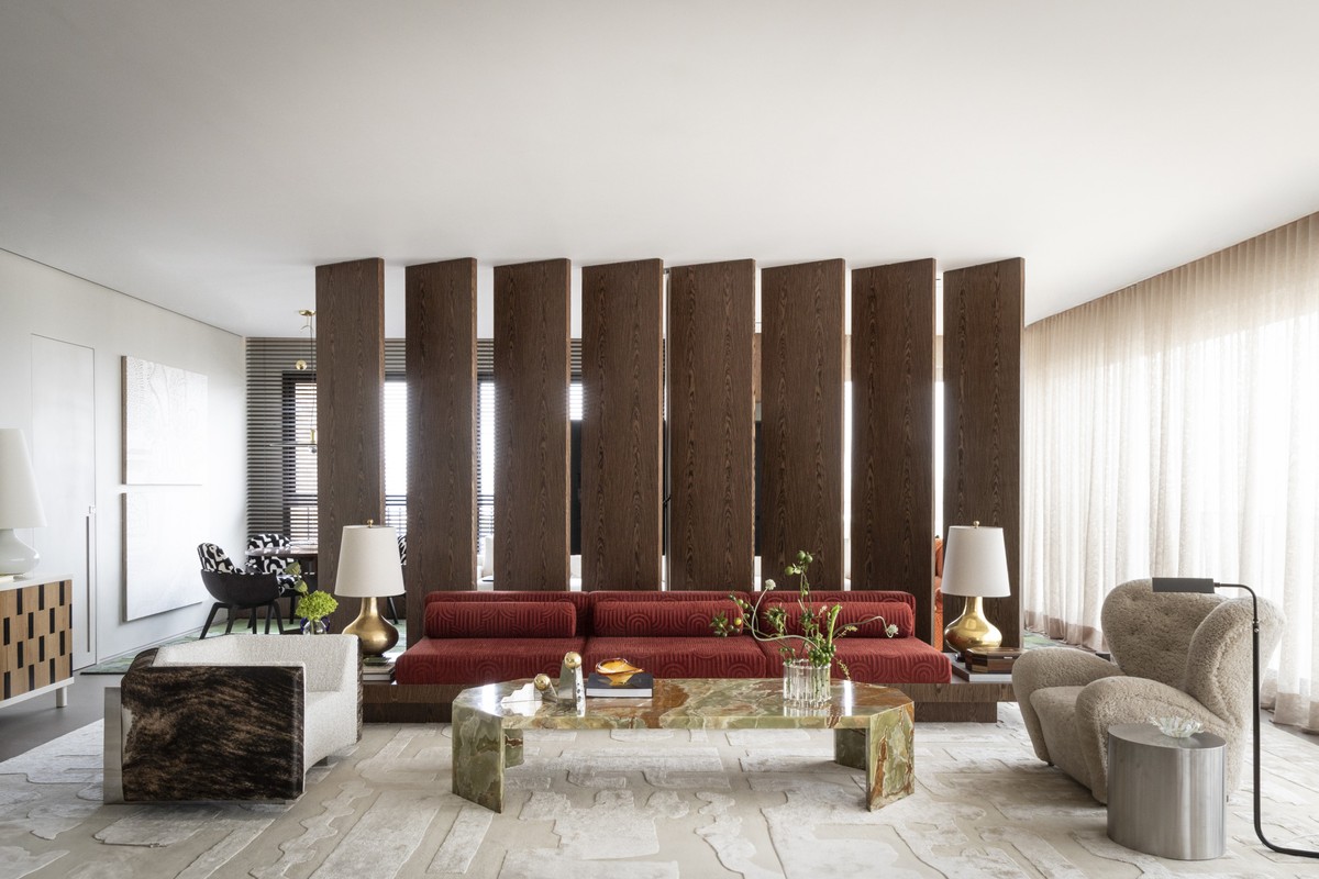 A casa é uma extensão materializada de seus habitantes – e este apartamento de 303 m², em São Paulo, morada de uma jovem empresária cosmopolita e colecionadora de arte e seu noivo, segue à risca essa premissa. Após anos vividos no exterior, ela trouxe um repertório extenso na bagagem: ponto de partida para o projeto de Felipe Saurin. “Todo o processo foi surpreendentemente fluido e intuitivo. Tivemos apenas uma reunião de briefing”, lembra o arquiteto. “O mais curioso é que a proposta foi desenvolvida enquanto a moradora ainda vivia em Londres. Com pouquíssimas oportunidades de encontrá-la pessoalmente, acabei levando uma mala cheia de amostras para um casamento em comum que teríamos em Sevilha. Durante um almoço, em uma hora, definimos todos os tecidos e acabamentos.”