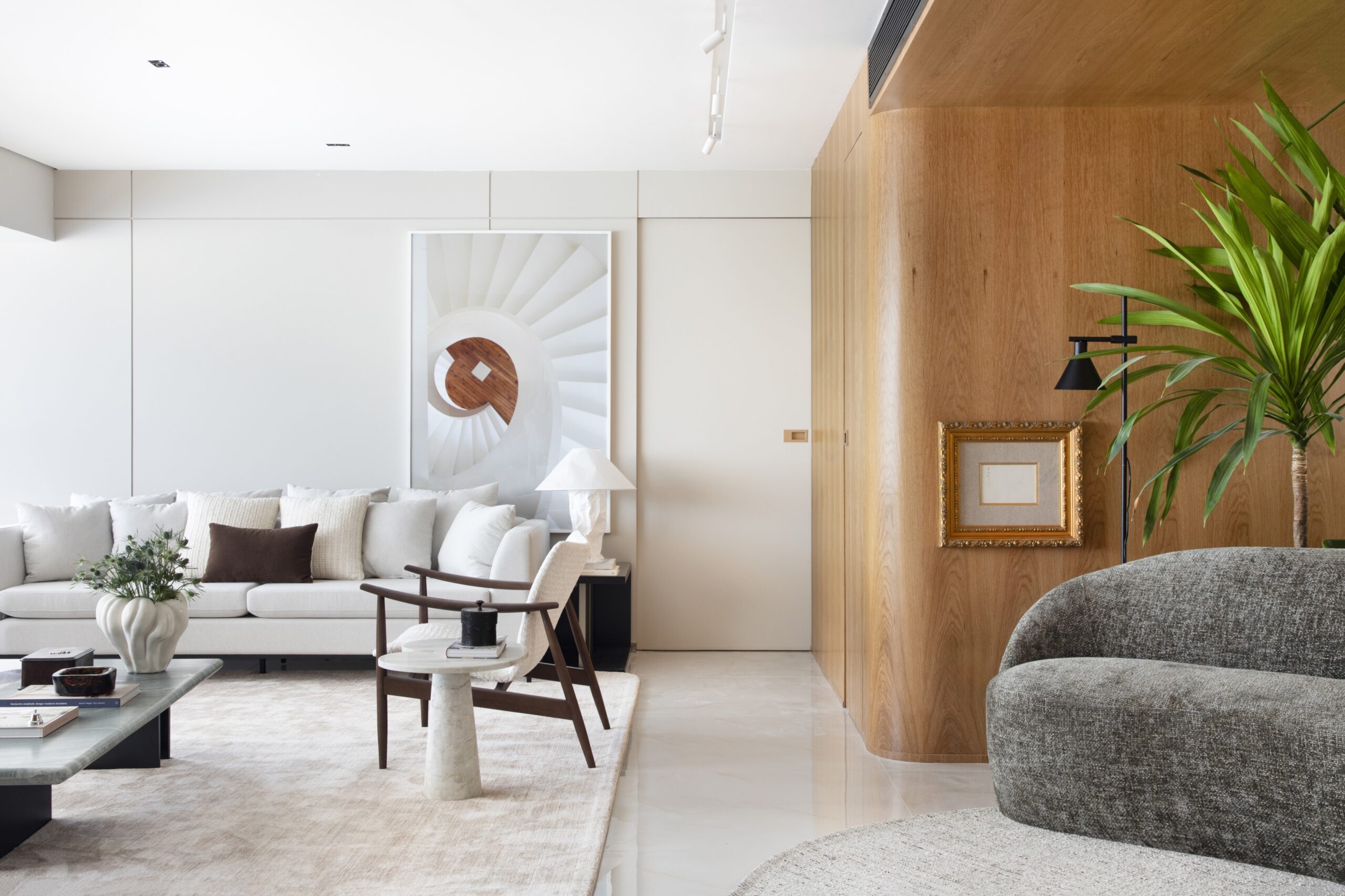 “Os moradores buscavam algo leve, mas, ao mesmo tempo, envolvente. Por isso, a solução foi trabalhar com materiais naturais, formas orgânicas e tons suaves, deixando que a arquitetura falasse com suavidade e que a vista fosse a verdadeira protagonista”, lembra o arquiteto. “Apostamos também em iluminação indireta e em mobiliário com desenho fluido, que abraça o espaço sem pesar – com destaque para o formato curvo dos painéis de lâmina natural de carvalho.”