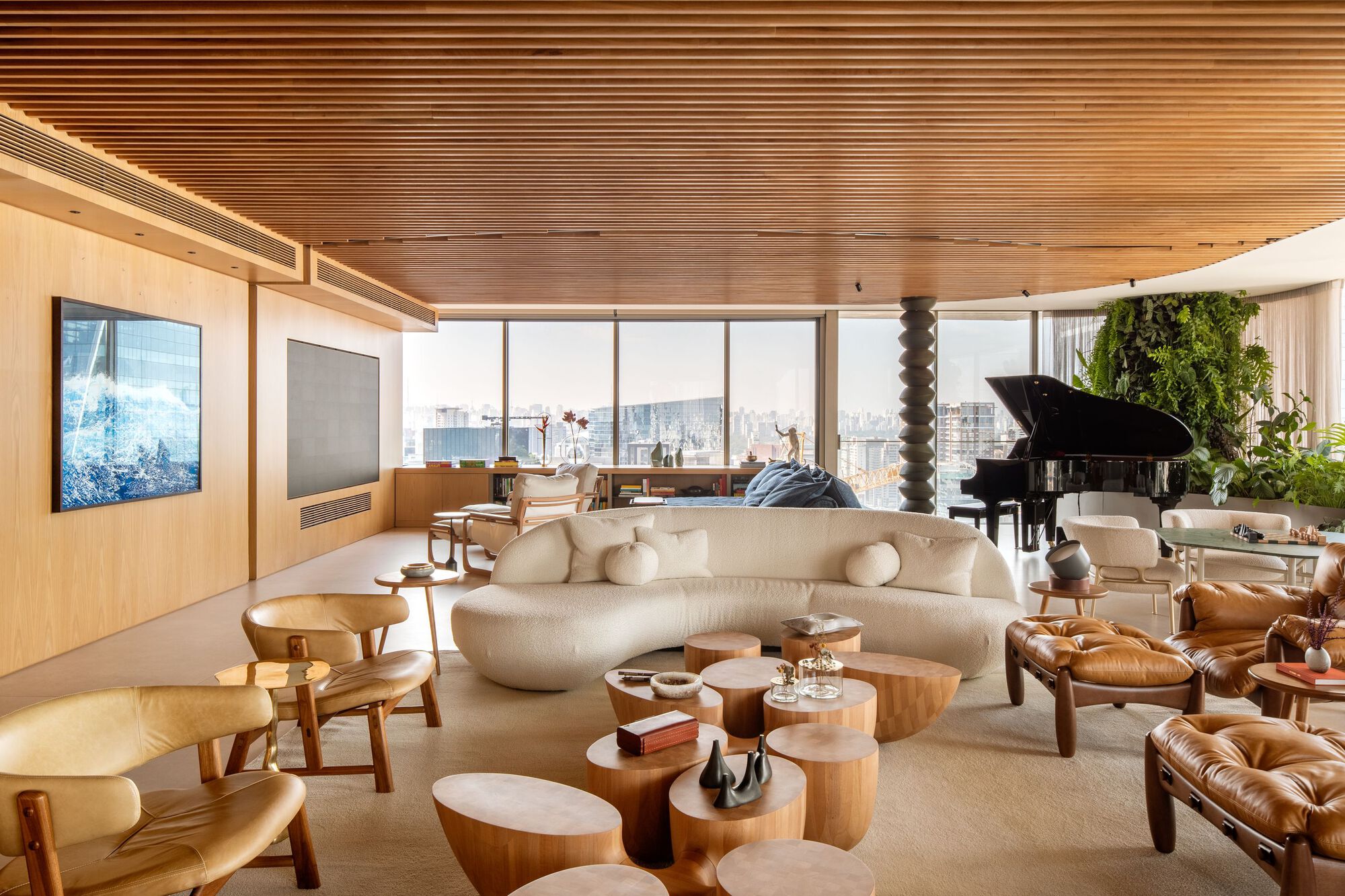 Trazer o verde para o interior foi essencial para configurar a noção de casa. Em colaboração com o estúdio de paisagismo Land N Citi, André Luque e o arquiteto paisagista Rulian Nociti desenvolveram um conceito original denominado “colunas atlânticas”. Essas estruturas de seção circular, fixadas no forro, são permeadas por espécies vegetais, criando um efeito de suspensão no espaço. Um dos pilares originais do edifício recebeu o mesmo tratamento paisagístico. Esses elementos assemelham-se a troncos de árvores, propondo uma construção quase poética que desafia os limites entre arte e arquitetura.