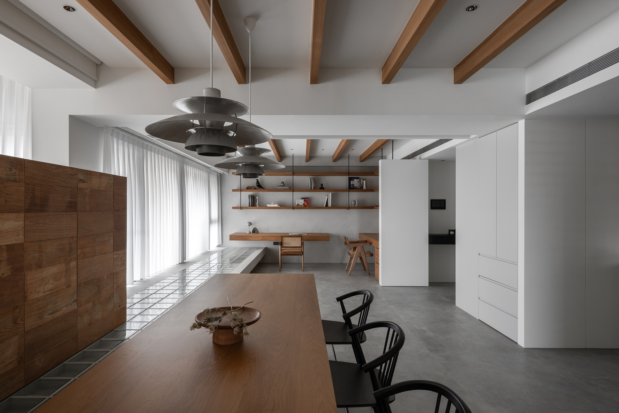 Em termos de materiais, a delicada textura do cimento serve como base, enquanto as expressões ricas da madeira envelhecida criam um contraste marcante, assemelhando-se a uma grande pintura no espaço. Quanto à fonte de luz, a translucidez dos tijolos de vidro suaviza a luz natural, criando uma atmosfera aberta e tranquila, conferindo ao ambiente uma rica cadência de vida.