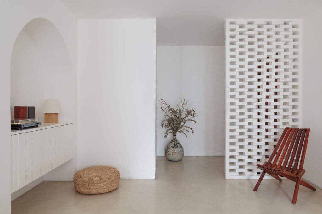 A estética minimalista dá o tom do apartamento através do piso monolítico em microcimento, das paredes brancas e marcenarias em lambri e muxarabi. O contraste se apresenta em pontos singulares, seja no uso dos mármores com seus veios bem marcados, assim como em quadros e objetos decorativos coloridos.