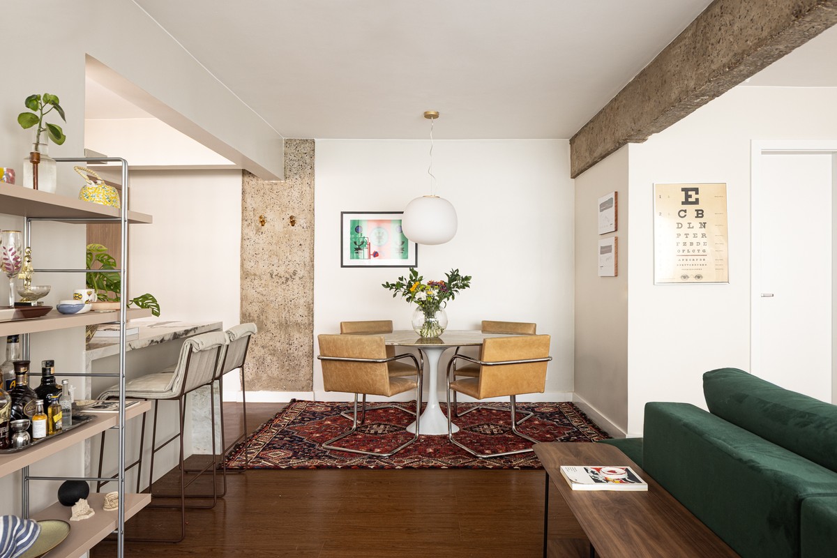 “Integrando sala, cozinha, varanda e um dos quartos, criamos uma espacialidade contínua, onde a luz natural percorre todo o apartamento. A porta camarão que conecta a varanda foi desenhada como uma transição sutil, mantendo a integração e reforçando a sensação de amplitude”, explica Isabella.