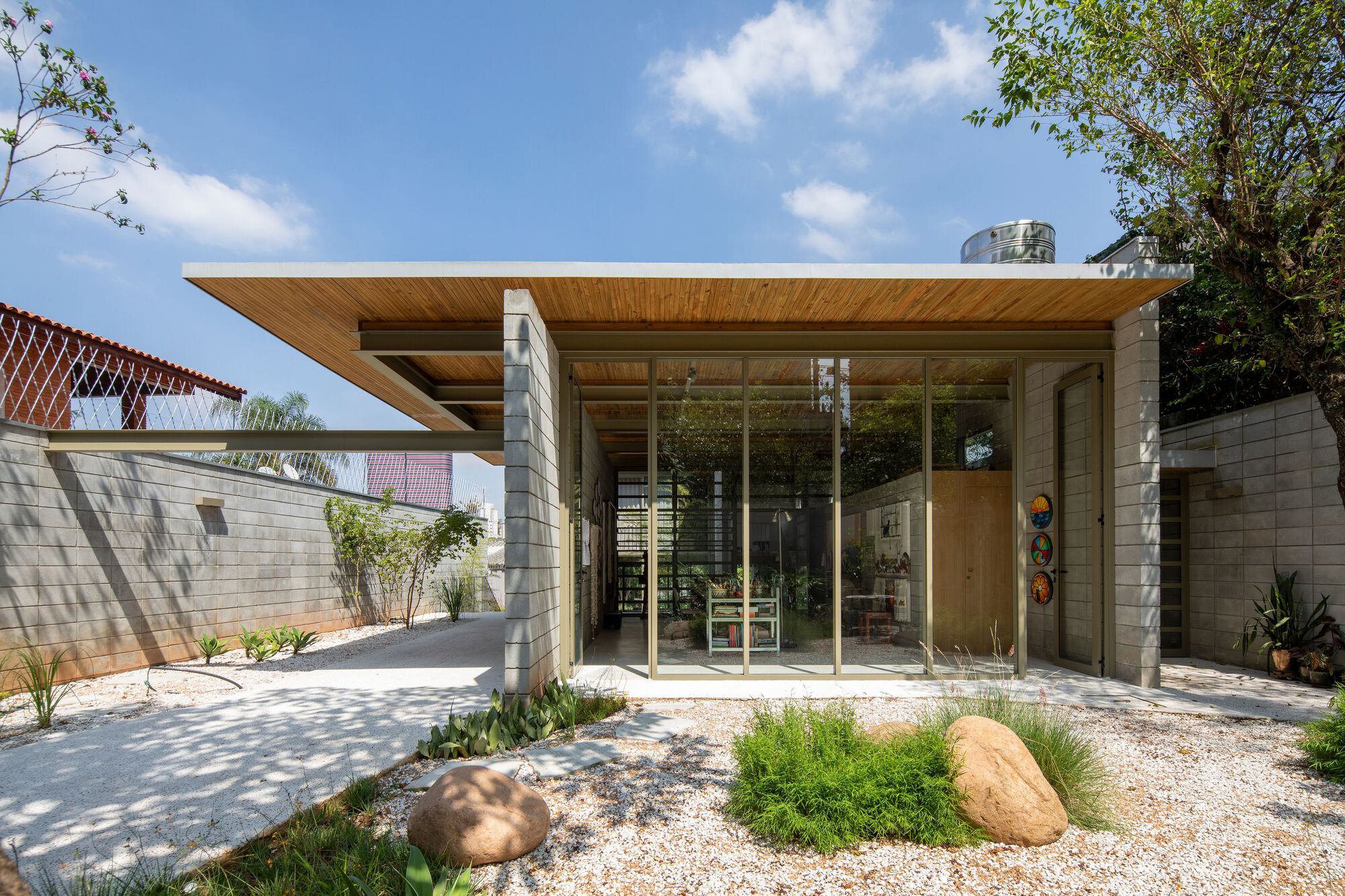 Descrição enviada pela equipe de projeto. A casa “Ateliê Residência EA” foi concebida para ser residência e local de criação de uma artista plástica. O projeto visou garantir a privacidade e independência do ateliê durante seu uso, mas também a integração dele com o restante da casa em eventos e aos finais de semana.