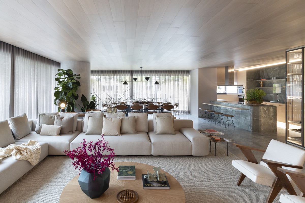 Para Luciano Amaral, CEO da Benx, incorporadora responsável pelo projeto, o feito é alcançado por meio da curadoria, já que cada profissional foi escolhido a dedo. “É um projeto coletivo com identidade única que misturou o clássico e o contemporâneo e que reforça o elo entre arte e habitar”, diz. A experiência começa na fachada, assinada pela MCAA Arquitetos, cujos brises modulares brincam com as sombras e garantem privacidade e amplitude visual. O paisagismo, por sua vez, foi idealizado pelo escritório Burle Marx e é composto por jardins sensoriais que integram natureza e urbanismo. O verde está por toda parte, e espécies brasileiríssimas criam microclimas que garantem mais conforto e sustentabilidade. Os interiores criados pela arquiteta Vivian Coser destacam o uso de mármores de diversas cores e apresentam mobiliário autoral de grandes designers, incluindo Zanini de Zanine, que também assina a escultura localizada na entrada do edifício e aberta para a cidade. As demais obras de arte distribuídas nas áreas de convívio foram selecionadas pela curadora Kátia d’Avillez.