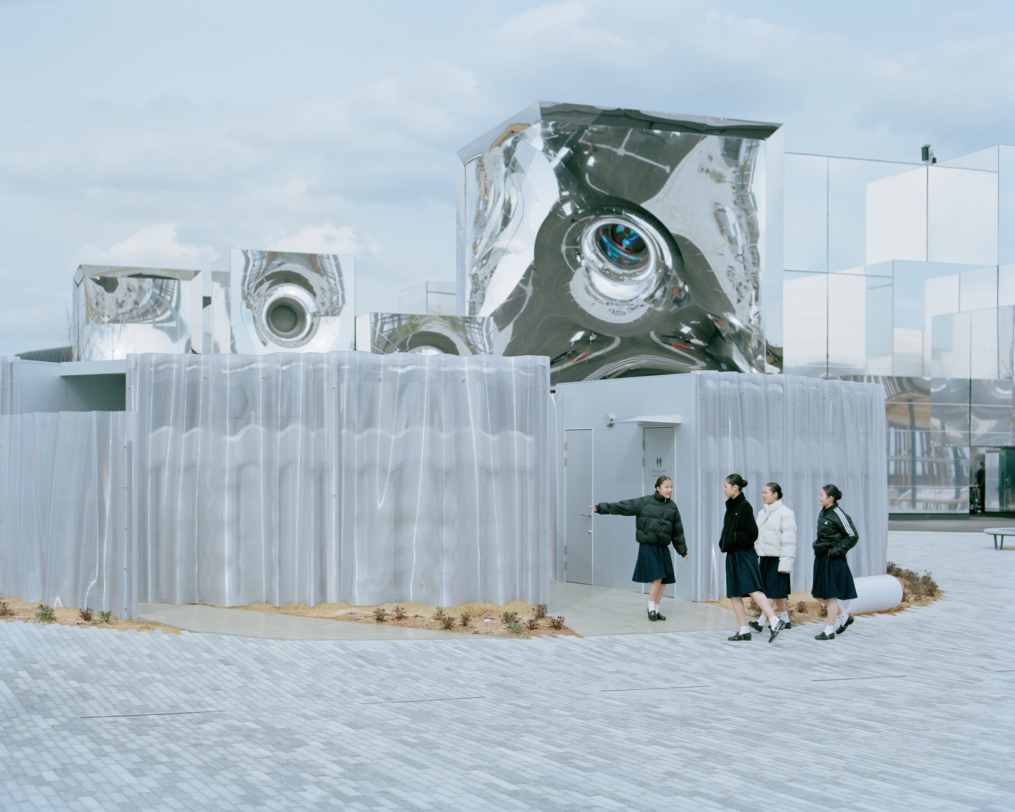 Descrição enviada pela equipe de projeto. Este é o projeto de um banheiro público concebido para a EXPO 2025. Em resposta ao contexto de uma praça cercada por marcos arquitetônicos icônicos, a estrutura foi pensada não como uma forma claramente definida, mas como algo que se recolhe ao fundo — uma arquitetura que cede protagonismo ao entorno, permitindo que os fenômenos e atmosferas ao seu redor se tornem o verdadeiro foco da experiência.
