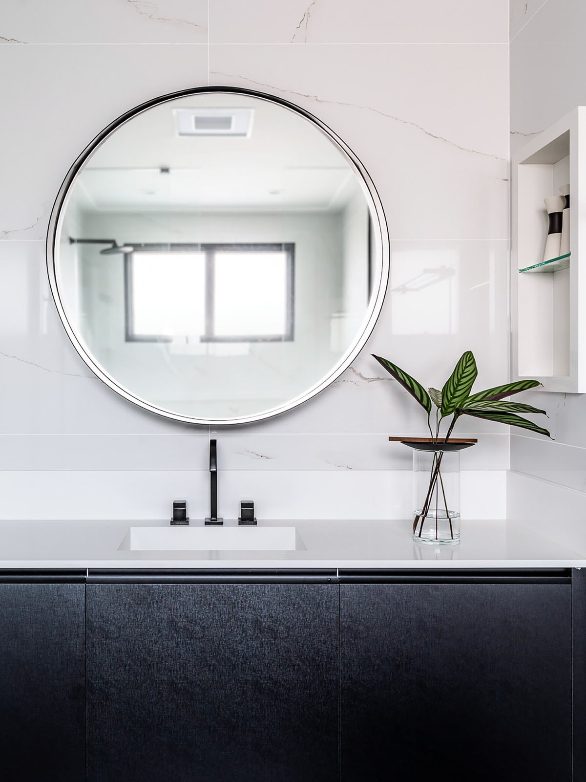 Uma pia de aço e um espelho que lembra ouriços-do-mar adornam o cômodo