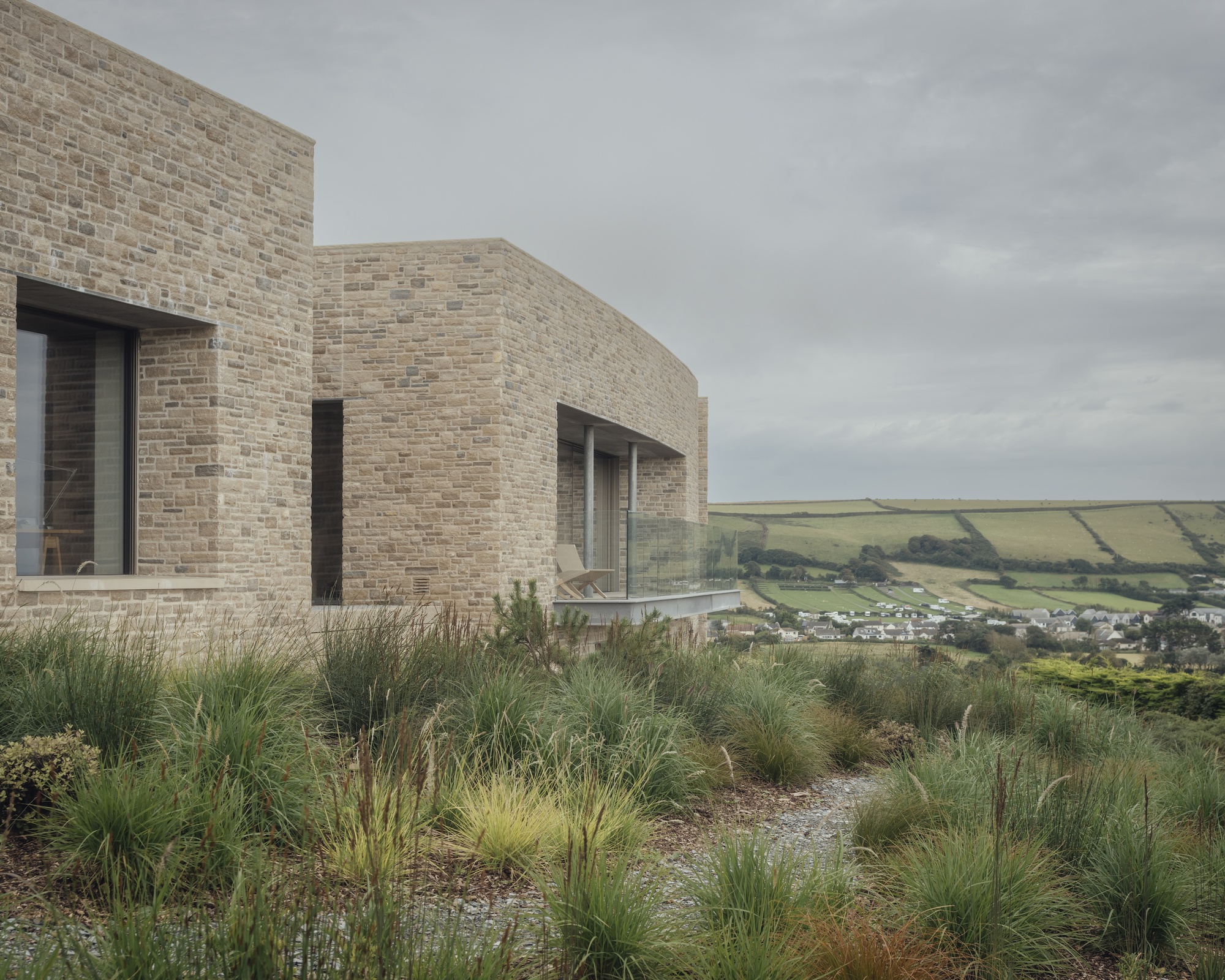 A residência reflete a abordagem do McLean Quinlan de criar casas em harmonia com a paisagem. A pedra Purbeck, extraída em Dorset, reveste a fachada robusta e resistente, escolhida para dialogar com os tons das dunas de areia vizinhas. No paisagismo, desenvolvido em parceria com o escritório local Eden Design, utilizou-se granito cinza-escuro da região e espécies nativas de gramíneas costeiras, que integram a casa à encosta.