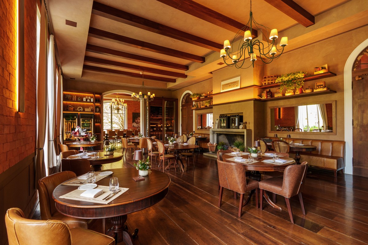 A identidade do espaço também se inspira nos tradicionais restaurantes italianos, mas sem deixar de lado a sofisticação: “Queria que fosse algo elegante, mas sem ser intimidante, e que conversasse com a paisagem ao redor”. O projeto, assinado pelo Projeto Mix Arquitetura em parceria com a Fossati Arquitetura, trouxe texturas e tijolinhos vermelhos para as paredes, que ajudam a criar um clima aconchegante juntamente com a iluminação indireta e a lareira que aquece o ambiente nos dias mais frios. Além de um teto com vigas de madeira aparente, o salão conta com uma imponente adega, que abriga rótulos italianos, espanhóis, franceses, alemães, argentinos, chilenos, húngaros, portugueses e brasileiros. Para completar, um toque de memória afetiva: Rafa Costa e Silva resolveu adornar o ambiente com dois quadros que retratam o seu avô – um durante infância e outro no serviço militar.