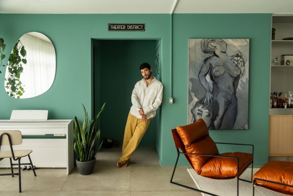 Ao lado da sala, surgiu um dos novos xodós do ator: um bar. “Era algo que eu sempre sonhei em ter”, diz. Além das bebidas, o espaço reúne peças únicas, como uma escultura do artista português Rafael Bordalo Pinheiro e um prêmio recebido pela peça A Herança, montagem brasileira do texto de Matthew López em que Bruno Fagundes participou como ator e produtor. A mesa de jantar, assinada pelo arquiteto e antigo amigo da família Antonio Ferreira Junior, também ganhou novo protagonismo. Com madeira mais escura e realocada para perto das amplas janelas, passou a ocupar um ponto com vista privilegiada. “A mesa estava onde hoje é o bar. Só que tem aquele janelão incrível, com vista para a copa das árvores. Eu falei: ‘É aqui que você tem que fazer suas refeições’. Só mudamos o posicionamento e já fez toda a diferença”, lembra Gabriel Rosa.
