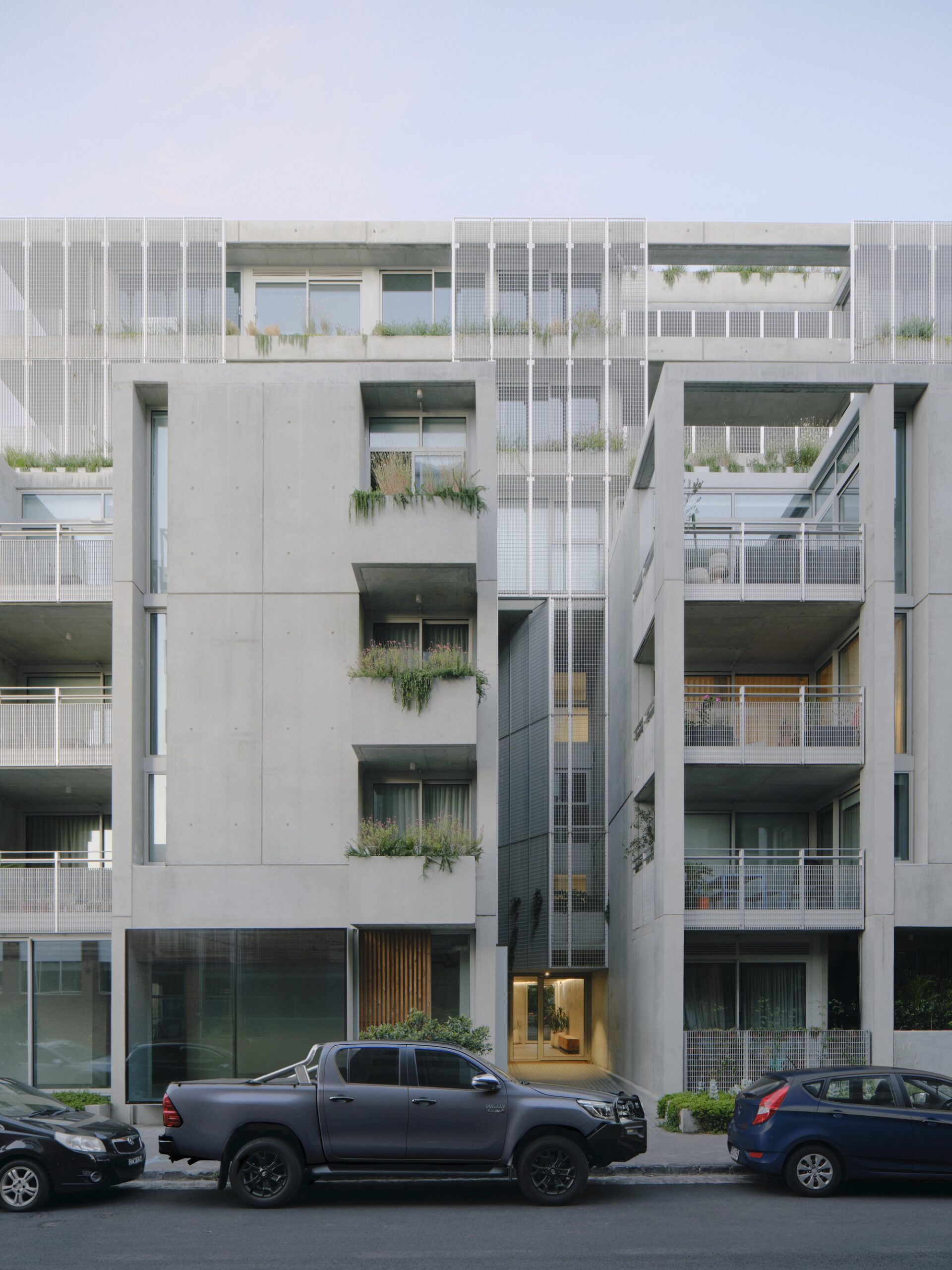 Esteticamente, o projeto se define pelo uso de concreto e telas metálicas, em uma linguagem brutalista que reinterpreta o caráter industrial da região. “O uso de um único material foi fundamental neste projeto. Ele foi escolhido não apenas por sua relevância em Brunswick, mas também pela qualidade atmosférica que transmite”, explica o diretor Richard Beel. “Apesar de ser um edifício monolítico e de material robusto, a forma como a fachada foi fragmentada, suavizada pela vegetação, revela também uma leveza em suas propriedades naturais e brutas.”