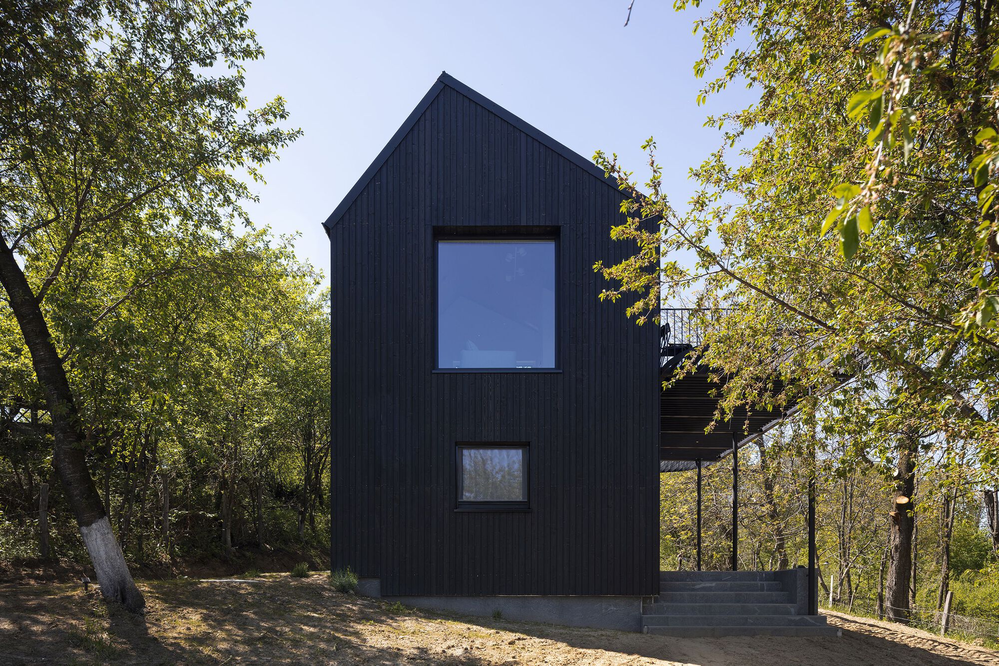 Deixando de lado as condições da construção e os materiais precários, a posição e a proporção do anexo eram harmoniosas, e a intenção era preservar esses aspectos desde o início. A solução propôs uma ampliação com uma área de escada interna e uma reconfiguração dos vãos/orientações de dentro para fora. Estruturalmente, a base permanece intacta, reforçada, e a superestrutura é feita em madeira. Por fim, o acabamento externo em madeira autoclavada preta completa e revela o cenário proposto. A altura e as dimensões excedem ligeiramente a imagem inicial. A escolha da cor externa é uma resposta direta ao contexto, oferecendo diferentes imagens e relações visuais dependendo da estação. A varanda de entrada intermedia a relação entre o módulo e o exterior por meio de uma estrutura metálica fina, proporcional à vegetação alta ao redor. As ripas e as áreas semicirculares definem espacialmente os momentos de aproximação da casa. No mesmo tom, o restante das áreas funcionais internas é sustentado por suas próprias conexões com o exterior. A pérgola da varanda se transforma em uma varanda profunda para a área de estar, e a fundação da casa se articula em um pequeno terraço para a área noturna.