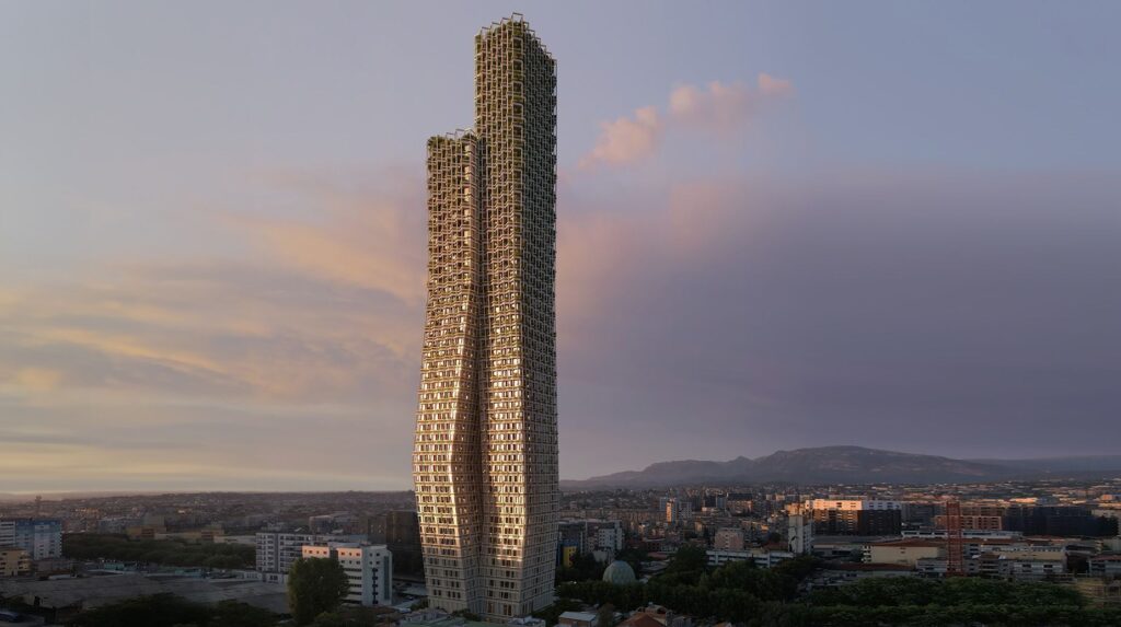 Na capital da Albânia, Tirana, onde uma série de novos edifícios em breve transformará o horizonte, arquitetos revelaram planos para construir um novo arranha-céu duplo que se curvará elegantemente como o plié de uma bailarina ou um amante se inclinando para um beijo.