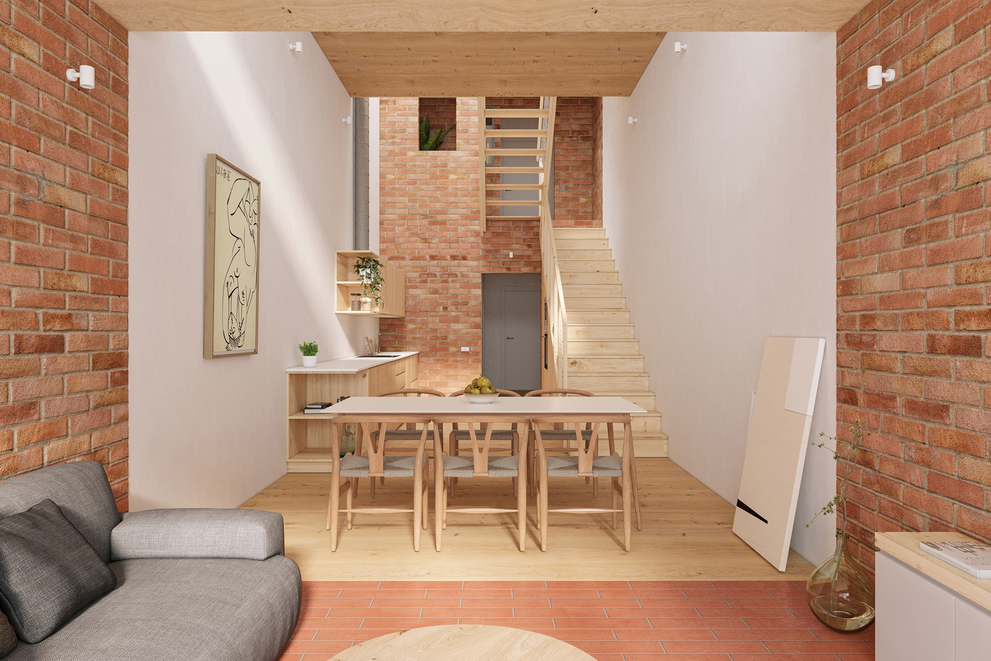 Esses espaços de transição são concebidos como galerias, onde as paredes de tijolo aparente e o piso cerâmico convidam à presença de vegetação. Essa estratégia aproxima o exterior do interior e suaviza a percepção de profundidade graças à entrada de luz sobre a sala de jantar. A combinação de materiais e as diferentes alturas internas geram espaços de qualidade no coração da habitação, apesar de suas proporções estreitas e alongadas.