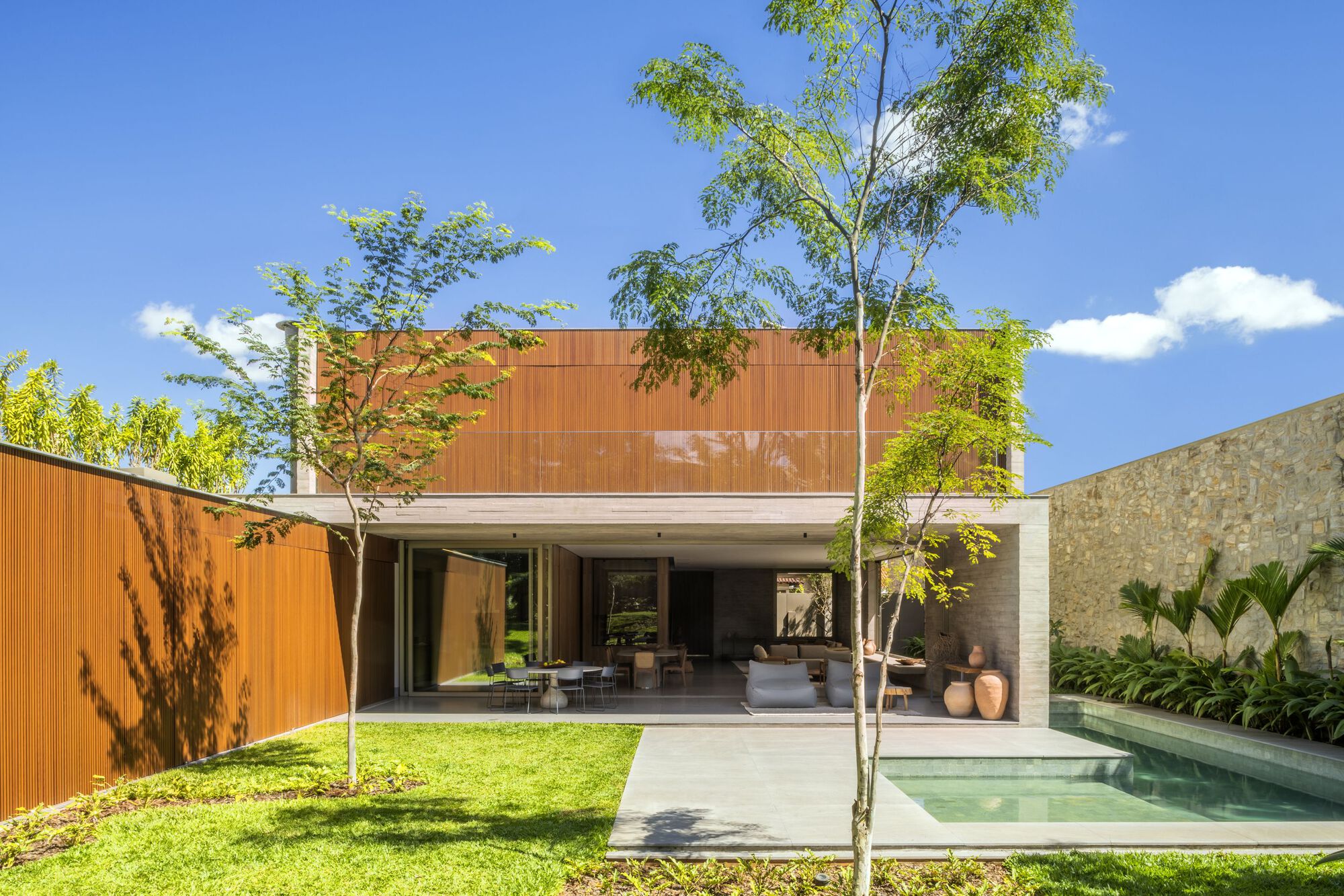 A prioridade foi o jardim, o que determinou a posição lateral da piscina, valorizando o espaço verde. A proposta era valorizar o bom design nacional e os móveis foram todos escolhidos a partir dessa premissa. O muro de pedra alto protege visualmente as interferências da construção do lote contíguo, além de criar um quadro impactante para quem está trabalhando na cozinha gourmet ou desfrutando a grande sala de estar.