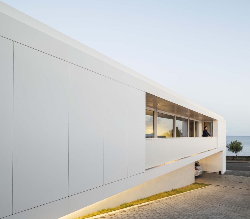 As áreas de salas e suite prolongam-se naturalmente tanto para varanda a poente como para o pátio exterior a nascente. Este último garante abrigo ao ruído urbano, ao mesmo tempo que oferece uma vista desimpedida sobre o mar. Os guarda-corpos metálicos de desenho oblíquo que compõem os alçados foram desenhados como elementos de proteção e segurança mas também como filtros visuais.