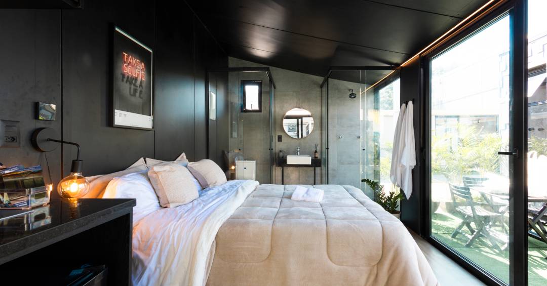 Esta cabana de 18 m², batizada Cabana Nomad, foi idealizada por Gustavo Pozzato em parceria com a equipe da 1Cômodo Arquitetura para divulgar a feira Construlev, que acontece de 4 a 6 de novembro. O projeto, executado em steel frame, foi pensado para oferecer uma experiência de habitar imersiva, sem abrir mão do conforto.