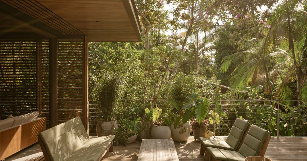 A proposta desta casa era ser um refúgio em meio à Mata Atlântica. A residência, assinada por Gui Mattos, se abre para um jardim de 150 m² concebido pela Jundu Paisagismo, escritório fundado por Airton dos Santos e especializado em integrar arquitetura à paisagem natural de maneira orgânica e sensível.
