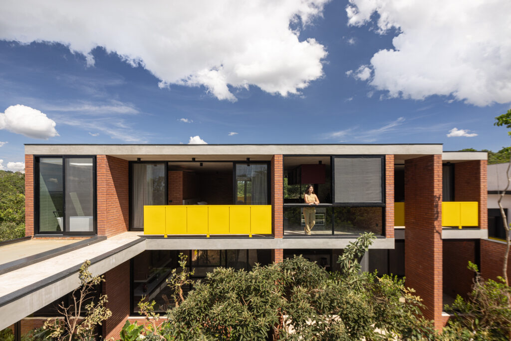 No ponto mais elevado do terreno, o ateliê da moradora, dedicado às atividades de arte e costura, fica completamente suspenso sobre dois pilares em formato de árvore. Ele se conecta ao espaço social da casa por uma passarela com brises metálicos amarelos, que protegem contra a insolação.