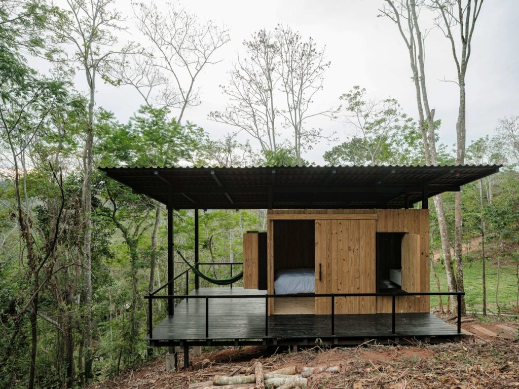 Nos interiores, a estrutura de madeira dialoga com o entorno e a varanda, voltada para a mata, convida a luz natural a adentrar o dormitório. A ideia é que estas construções singelas auxiliem os participantes dos retiros a se desconectarem do mundo e se reconectarem com a natureza. “A Cabana Zero propõe um modo de habitar leve e reversível — que não se impõe à paisagem, mas nela se dissolve”, conclui Felipe.