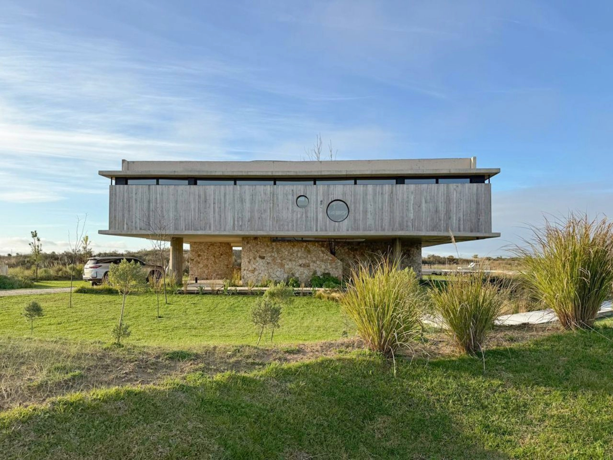 Sobre uma fundação de pedra que reúne todos os serviços, apoiam-se duas lajes de concreto que configuram o andar superior, onde estão localizados os espaços comuns e dormitórios, priorizando as visões e a insolação dos mesmos. A casa foi implantada rotacionada em relação às linhas de frente e laterais do terreno, para que a área social olhe para o norte, abrindo-se também para o oeste para ver os pôr do sol. Além disso, a suíte principal e os dormitórios de uso mais cotidiano foram orientados para o leste para ver o amanhecer e receber o sol da manhã.