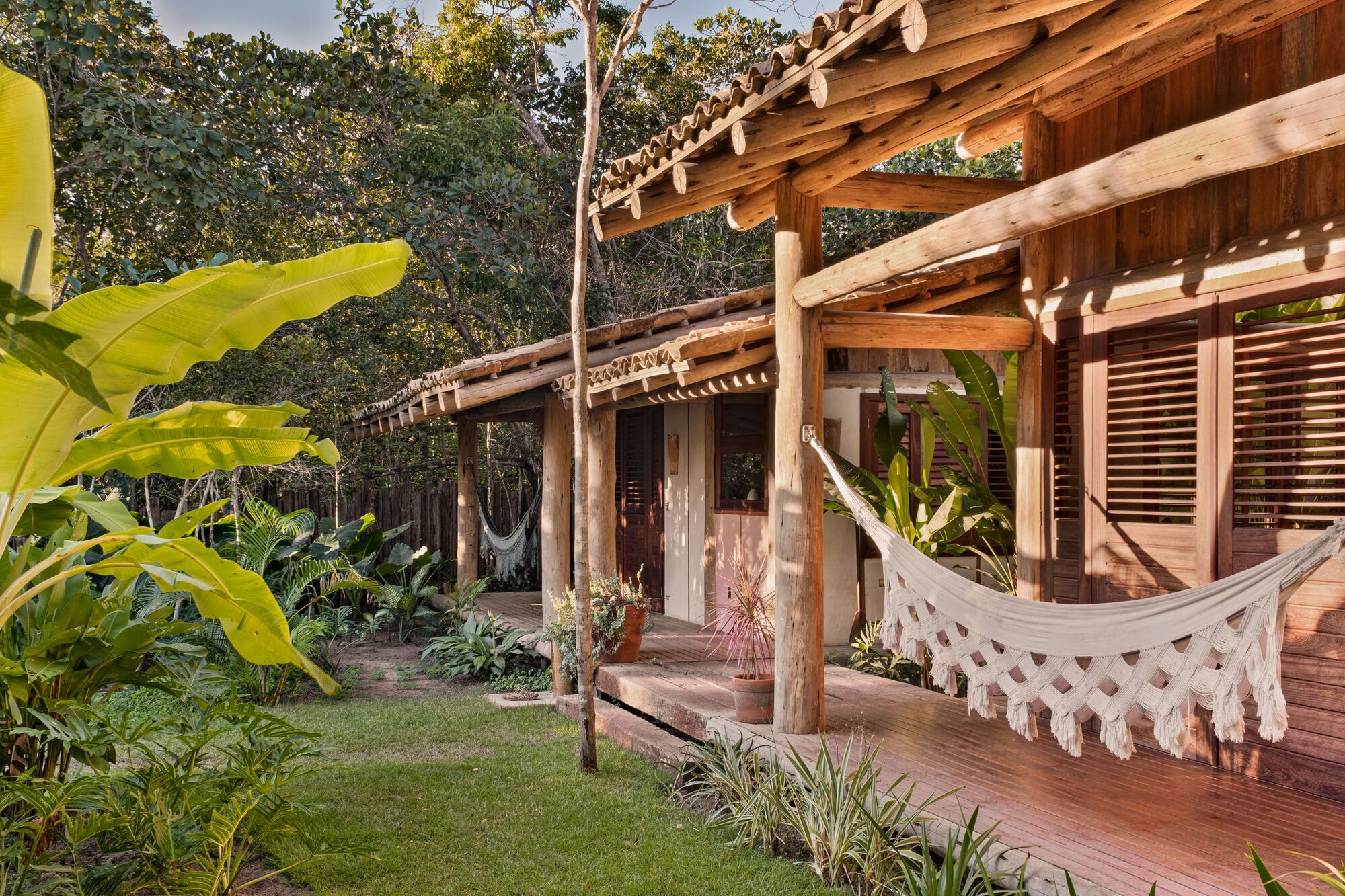 A relação entre os espaços internos e externos é feita de maneira generosa. O desenho da casa promove uma sensação de integração constante com a natureza, sem tentar impor sua presença, mas criando uma convivência mútua com o terreno e as árvores ao redor. As portas camarão de Tatajuba, amplas e leves, proporcionam essa interação, abrindo-se para a brisa e os sons da mata ao redor, mas também garantindo o necessário resguardo quando fechadas.