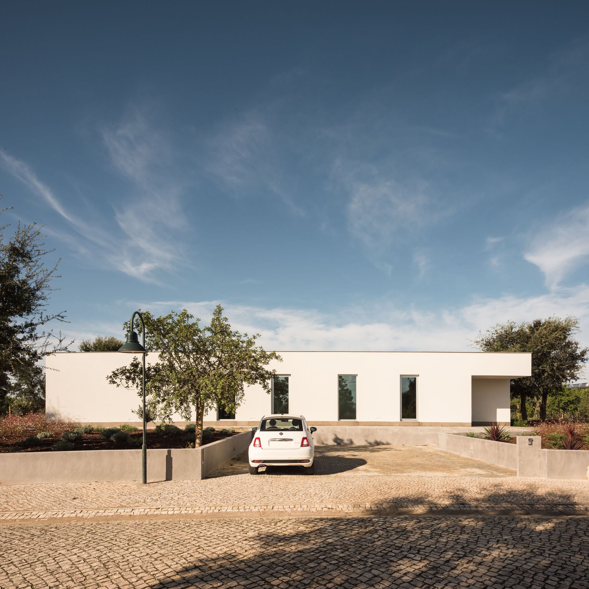 Com uma planta em forma de “L”, organiza-se de forma a distinguir claramente os espaços públicos dos privados, sendo o acesso feito pela rótula norte. No corpo mais comprido, desenvolvem-se três quartos, três instalações sanitárias e um terceiro espaço que pode funcionar como escritório ou quarto de hóspedes. No corpo mais curto, localizam-se a cozinha e a sala de estar/jantar, mediadas por um pátio interior.