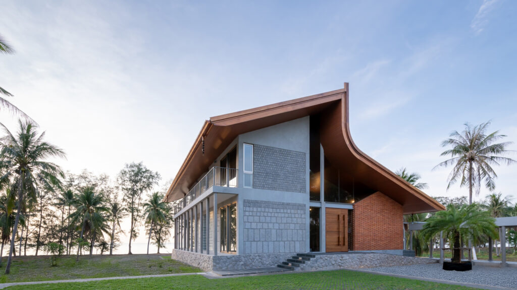 À beira-mar, entre coqueiros, ergue-se uma casa que atua como moldura e abrigo. Situada na vasta e intocada praia de Thapsakae, na província de Prachuap Khiri Khan, no sul da Tailândia, ela é pioneira na ocupação dessa paisagem serena. O conjunto acolhedor é composto por uma casa de pedra, um pequeno galpão de tijolos sobre uma base de pedra, e um pavilhão aberto protegido por um amplo telhado que unifica os volumes sob sua sombra generosa.