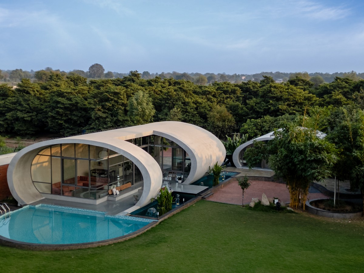 Eles imaginaram “espaços onde paredes e tetos se dissolvem em conchas orgânicas, quase ovais”. A casa parece esculpida dentro de uma tubulação de concreto, já que o material foi moldado em perfis curvos, formando volumes cilíndricos contínuos, sem emendas — como se estivessem simplesmente pousados sobre o solo.