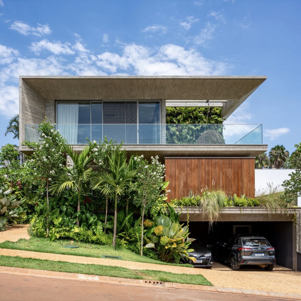 A chegada: uma imersão gradual no verde. A experiência começa já na chegada, ao atravessar um jardim denso e cuidadosamente desenhado pelo paisagista Amaury Neto. O visitante é conduzido por entre a vegetação até a entrada principal, onde o volume contemporâneo da casa se revela. A volumetria, marcada pela leveza estrutural e pelo uso de materiais naturais — como concreto aparente, pedra e madeira —, cria uma moldura que antecipa o convite: adentrar um espaço onde arquitetura e paisagem se fundem.