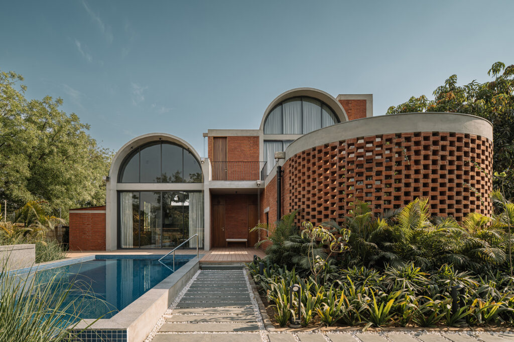 A essência do lar está na sinceridade dos materiais. Paredes estruturais de tijolo aparente servem de pano de fundo tátil para as linhas puras das abóbadas de concreto. Pisos de terrazzo off-white da Bharat Floorings, com discretos pontos de cor, percorrem toda a casa, em diálogo com móveis sob medida em teca maciça e detalhes em latão. Os sistemas de climatização, elétrica e iluminação foram deixados expostos, assumidos como parte da arquitetura em vez de escondidos como complementos secundários.