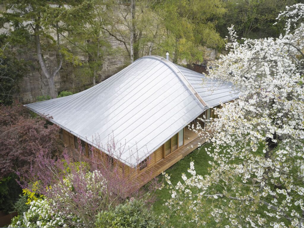 Para simplificar a instalação do zinco, o telhado é uma superfície desenvolvível, ou seja, resultante da simples deformação de um plano. Cada faixa de zinco é torcida para seguir a elevação do telhado que abriga o ateliê no andar de cima.