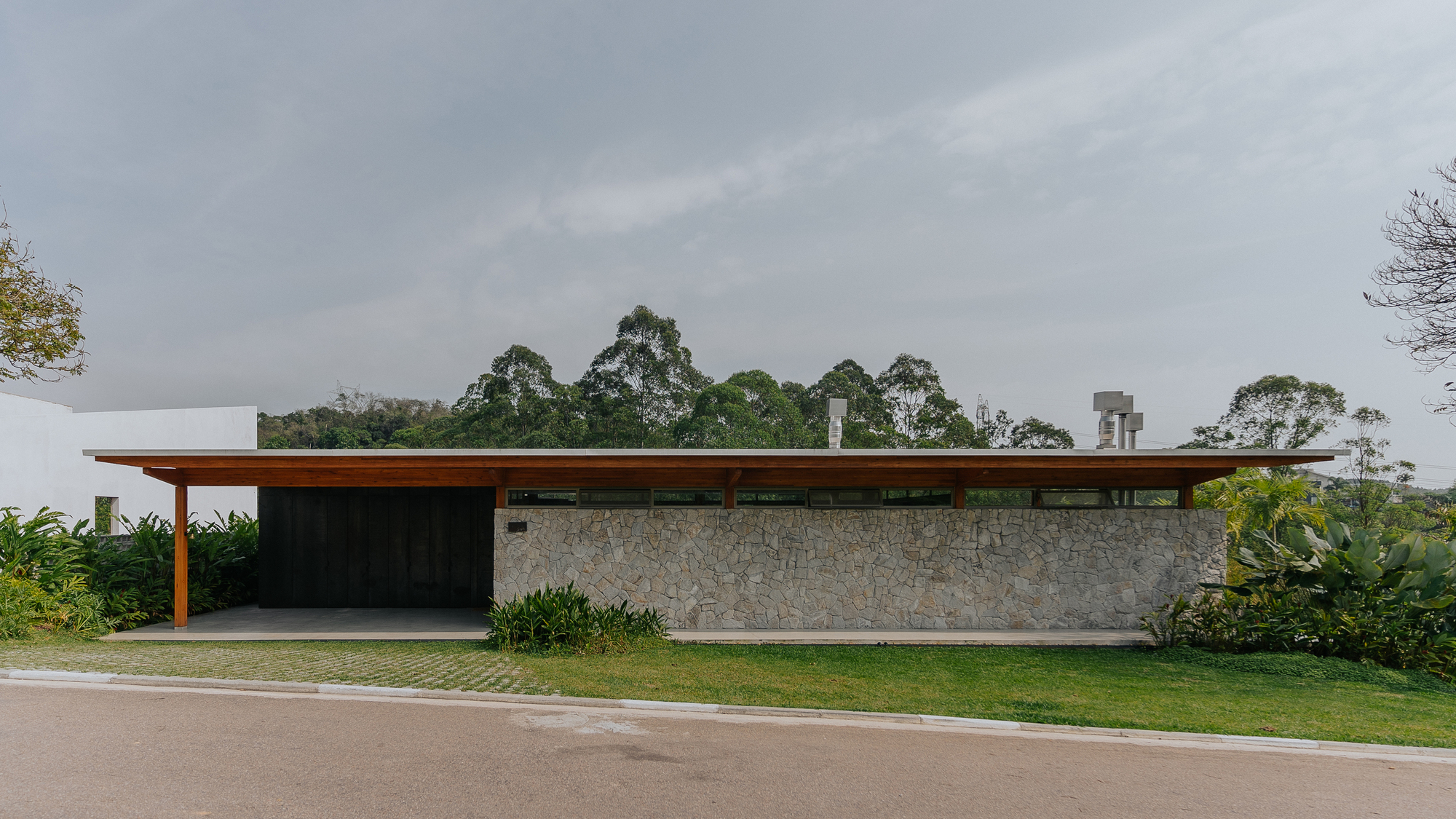O bloco da área social ocupa a fachada frontal do terreno e faz uso da madeira laminada colada (MLC) como estrutura para a cobertura que por sua vez é de telha metálica termoacústica. A fachada, discreta, é toda revestida em pedra Moledo, com janelas altas que permitem a ventilação cruzada dos ambientes internos, garantindo o conforto térmico e preservando a privacidade. Um recuo no volume conforma o acesso principal e a garagem da casa, com um grande painel em aço cortén compondo a porta de entrada e um armário depósito.