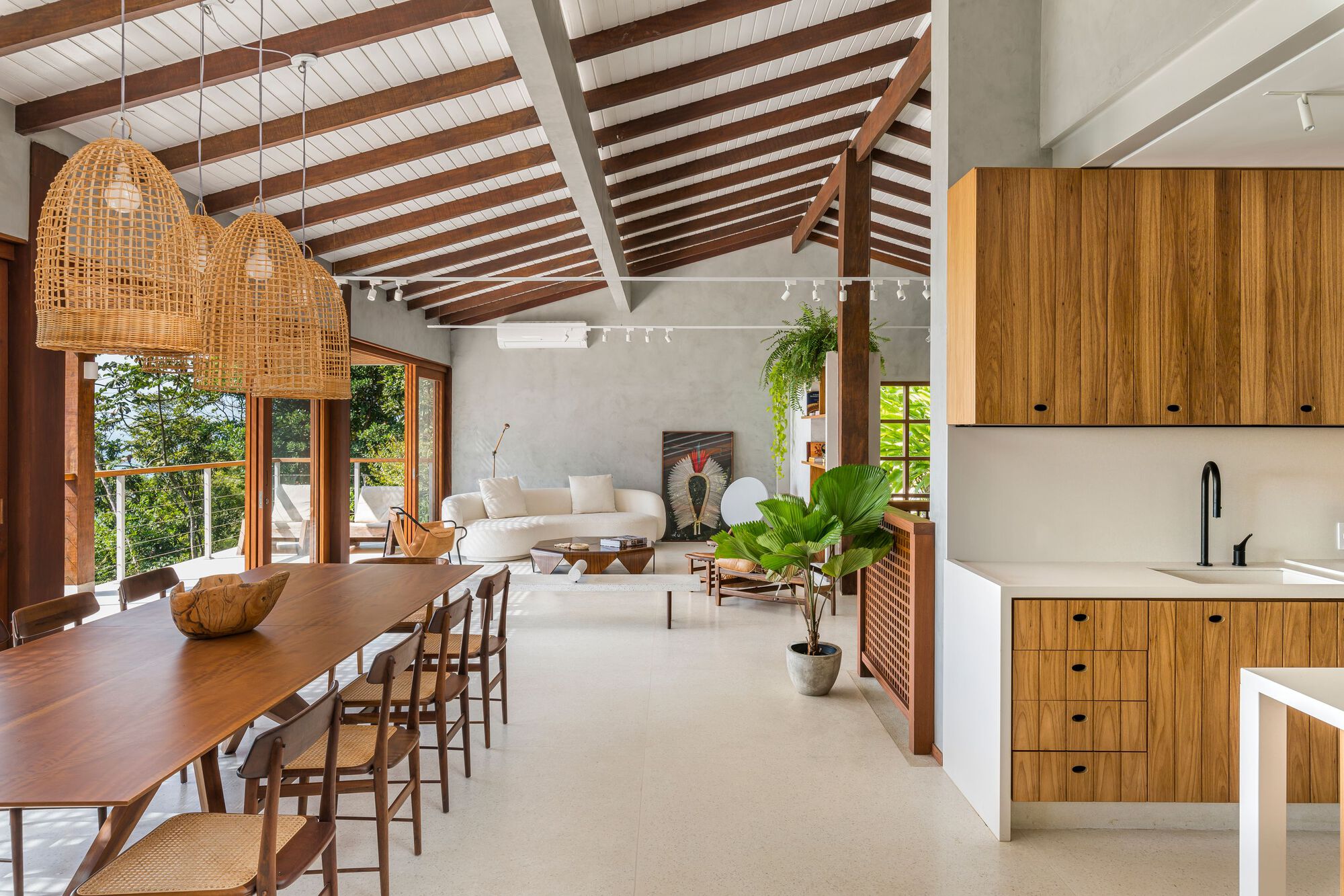 Descrição enviada pela equipe de projeto. Localizada em um terreno com vista privilegiada para o mar de Ubatuba, no litoral norte de São Paulo, esta casa de veraneio passou por uma transformação ao longo de mais de dois anos, sendo concluída em junho de 2024. Com 400 m² construídos em um terreno de 4 mil m², o imóvei foi comprado por uma família que mora fora do Brasil. O projeto de reforma manteve ao máximo a estrutura original, como vigas e o telhado, mas implementou uma nova configuração interna, a partir da criação de grandes vãos para integrar sala de estar e cozinha e abrir a casa para o mar.