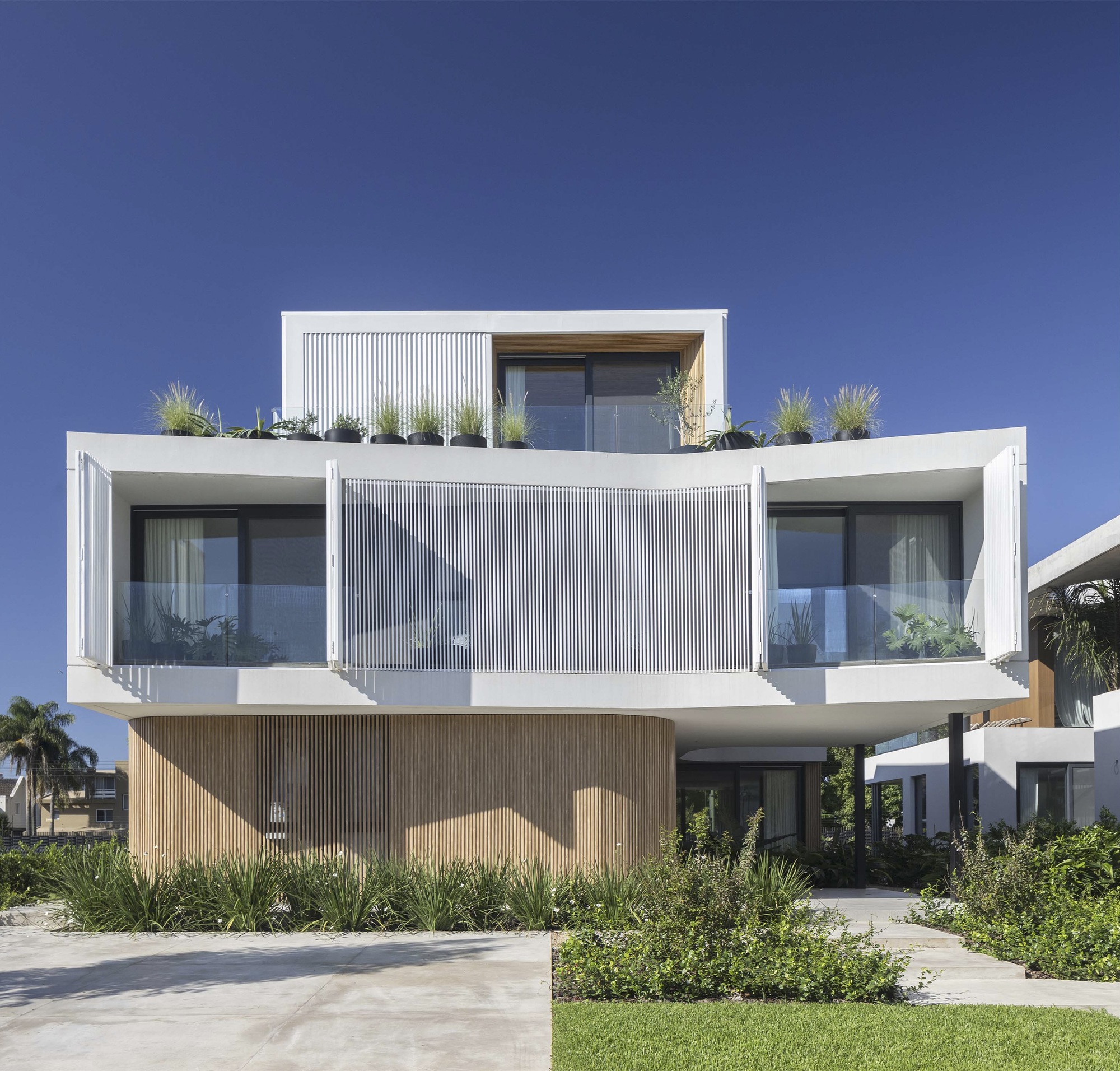 A casa incorpora referências a essas vibrações na própria arquitetura. O uso de curvas e contracurvas dá movimento à residência. Grandes espaços interligados fluem naturalmente com o entorno, ao mesmo tempo que criam um refúgio íntimo, convidando ao encontro neste novo mundo. Um pátio interno se abre a partir do interior, gerando luz, visibilidade e conexão. Por meio dessas operações, a Casa Weip se torna um reflexo e resultado dessas vibrações.