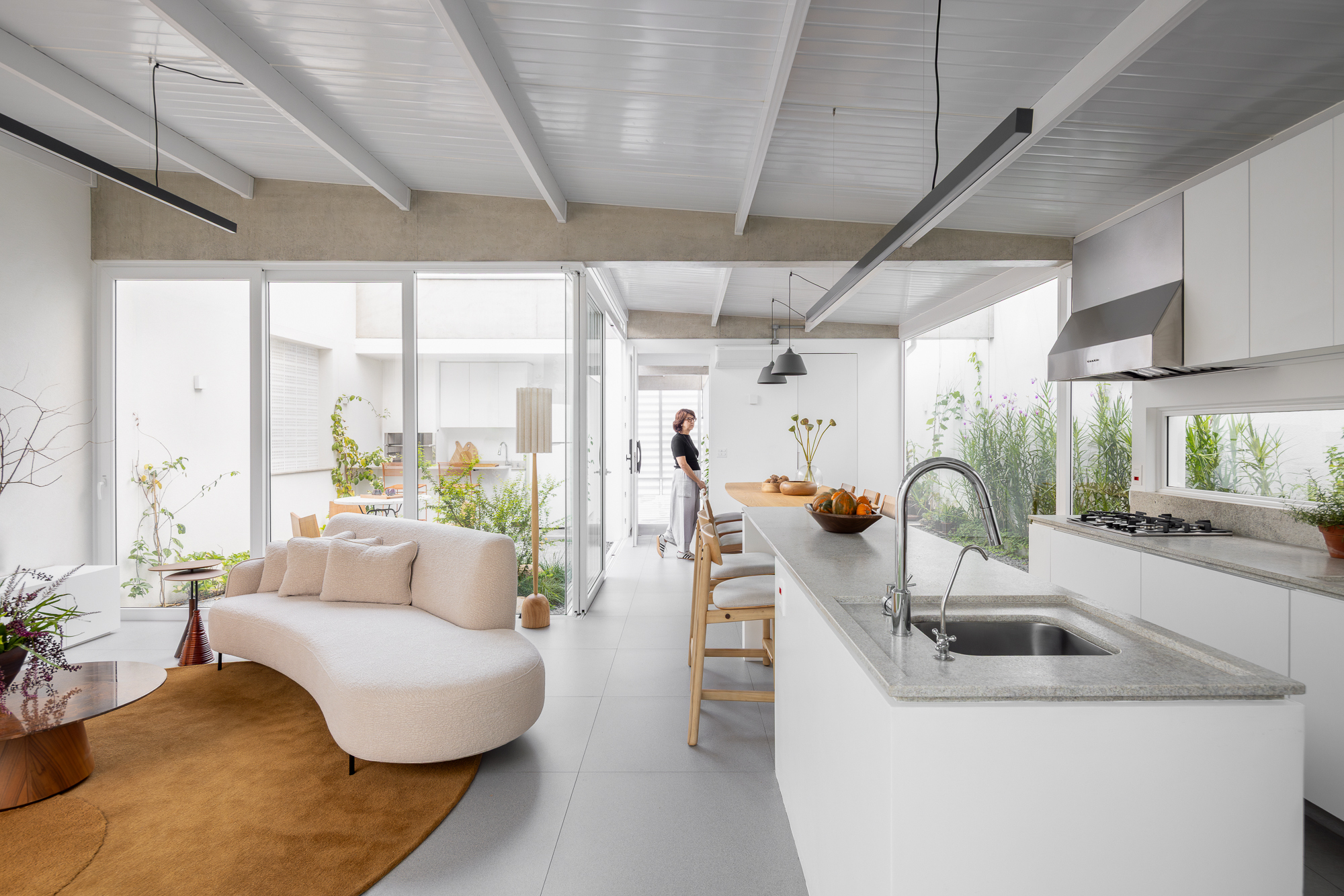 A espacialidade varia de acordo com a função do ambiente. Os espaços íntimos e de serviço possuem volumes fechados com pé-direito mais baixo, enquanto os sociais apresentam pé-direito elevado e coberturas inclinadas com telhas metálicas, além de amplas superfícies de vidro que criam integração visual com o exterior.