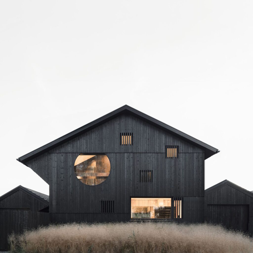 Assim como nos celeiros circundantes, a forma da fachada evita a água parada na extremidade das tábuas. As janelas dos cômodos que requerem proteção estão ocultas atrás das estreitas aberturas verticais na fachada, protegendo-as de vistas externas. Grandes aberturas circulares oferecem às casas uma face voltada para a rua e criam uma vista das copas das árvores ao redor a partir do interior. Projetada para três gerações de uma família, uma casa é ocupada pelo pai, a outra por seu filho com sua esposa e filhos. As casas são quase idênticas por fora, mas diferem no interior devido às diferentes necessidades de seus ocupantes. Elas têm uma área relativamente pequena de 90 metros quadrados cada. A restrição de altura no térreo e no sótão tornou necessário construir um porão para os necessários cômodos auxiliares, como salas técnicas e armazenamento. Há apenas um grande cômodo no primeiro andar, que é sustentado por um único pilar – não há outras paredes internas. Uma caixa de madeira foi situada apenas na parte posterior para acomodar a entrada, o banheiro e a cozinha.