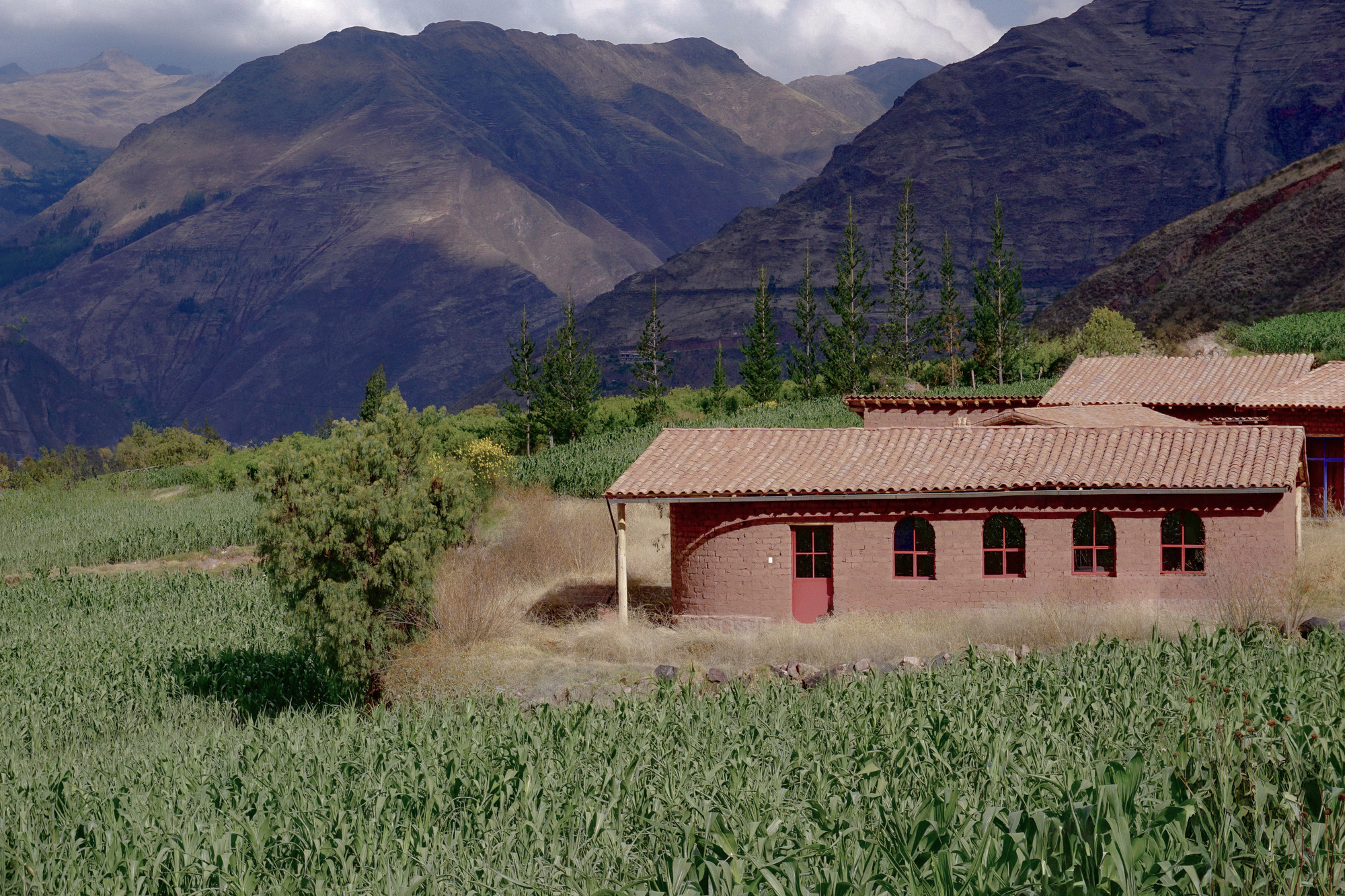 As varandas prolongam a experiência do interior em direção à paisagem circundante. A varanda nordeste, coberta e situada entre a cozinha e o salão, recebe a luz da manhã. A noroeste, semicoberta e em continuidade com o desnível do terreno, funciona como mirante para o Apu Sahuasiray. Já a fachada oeste incorpora vitrais coloridos que filtram os últimos raios do sol, tingindo o interior com matizes quentes e contribuindo para a acumulação térmica das paredes.