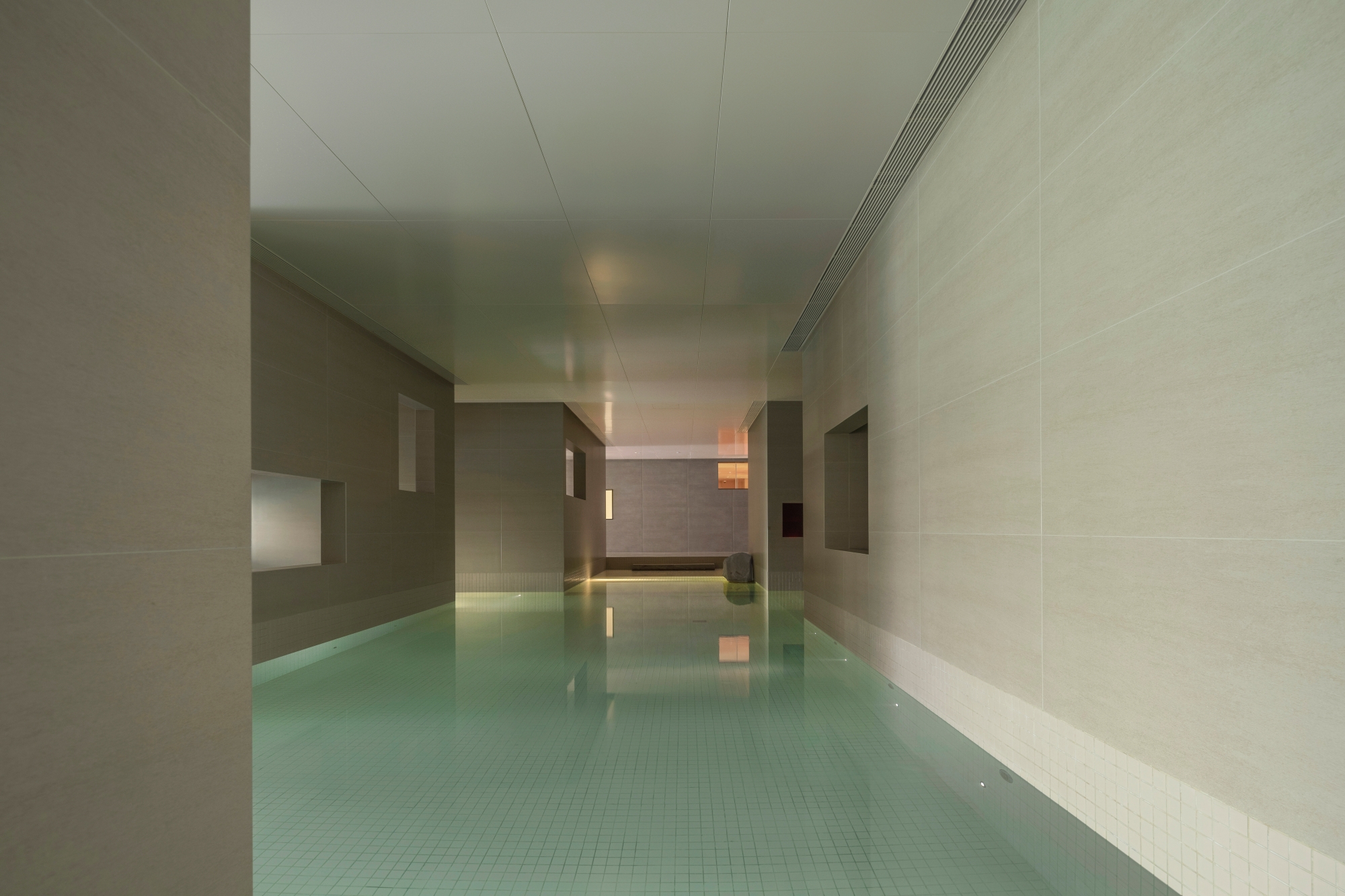 A partir desse ponto, inicia-se uma jornada sensorial, guiada pela luz e organizada em torno do tema da água. Próximo ao pátio, a luz solar ilumina as piscinas paisagísticas, criando uma atmosfera clara e estimulante. Mais para dentro, a luz se suaviza, envolvendo um pátio aquático mais tranquilo, de sensação serena e delicada. No extremo mais profundo — onde a luz quase desaparece — salas de vapor secas e úmidas e piscinas mais profundas formam um ambiente mais íntimo e voltado para o interior, conduzindo os visitantes a um espaço privado e imersivo de restauração física e emocional.