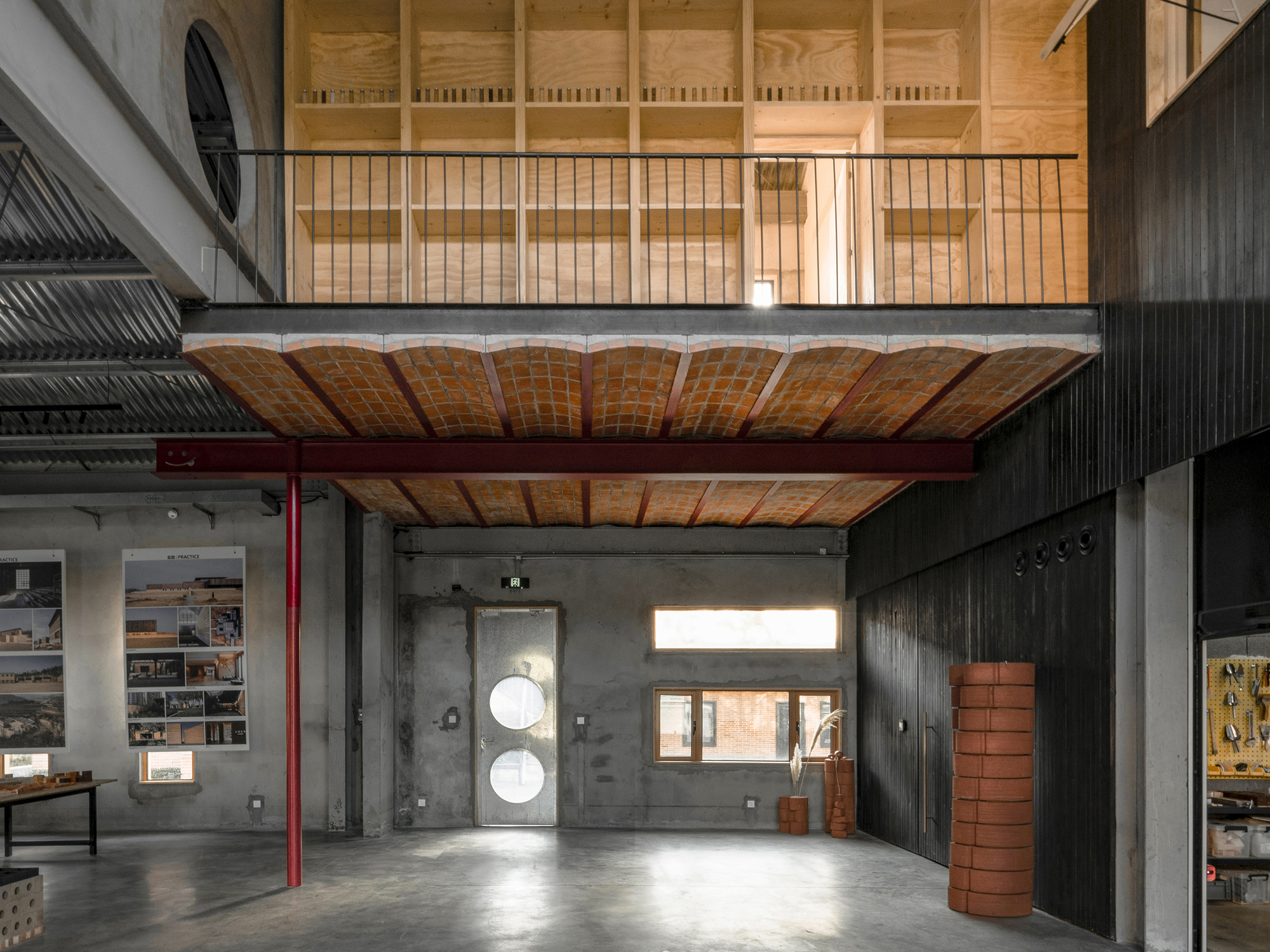 Dentro dessas estratégias de baixa tecnologia, nascidas de restrições práticas, reside o desejo habitual do arquiteto de abraçar novos desafios. Por exemplo, a laje adicionada na sala de reuniões: escolhemos construí-la usando uma abóbada de tijolo com nervuras de aço estrutural (abóbada catalã). Dez vigas de aço em forma de “H” (120x85mm), espaçadas a 630mm, formaram o esqueleto, com tijolos vermelhos colocados em abóbadas entre elas, cobertos com um preenchimento de concreto. AA história da abóbada de tijolo é antiga, com uma longa tradição no noroeste da China de construir habitações escavadas com abóbadas de tijolos de terra, conhecidas como gu yao (箍窑). Toda a nova laje é sustentada por uma grande viga em ‘H’ e um pilar de aço maciço com 14 cm de diâmetro.