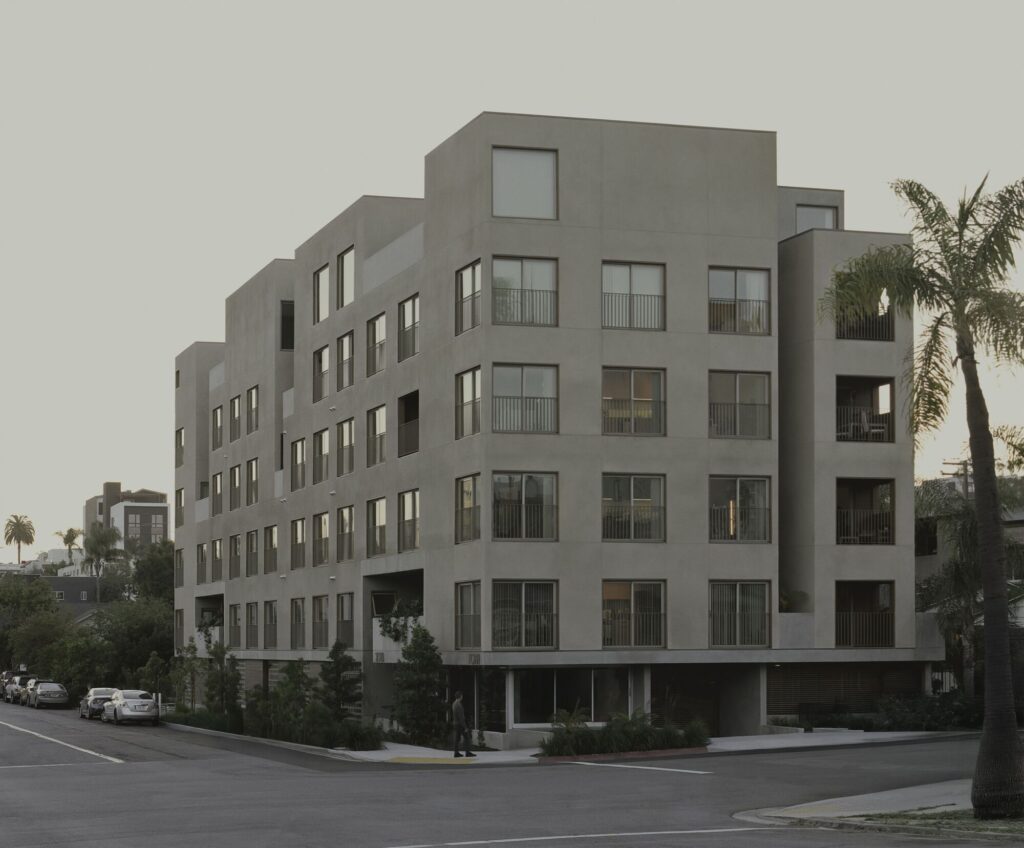 Aproveitando o clima ameno de San Diego, o projeto reinterpreta a circulação externa como um sistema aberto de relações entre unidades, vizinhos e espaços compartilhados. Terraços, varandas e passagens semiabertas expandem a esfera doméstica, criando pontos de observação tanto para o interior — o coração do edifício — quanto para o exterior, voltado à vida da rua. Essa porosidade espacial estimula encontros informais e fomenta um senso de comunidade mais flexível, dinâmico e conectado ao cotidiano urbano.