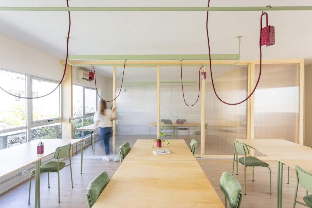 Um sistema de painéis de correr permite transformar o espaço, gerando em um dos lados uma sala de reuniões privada. Em sintonia com essa lógica, desenvolveu-se um sistema próprio de alimentação elétrica aérea: uma barra suspensa no teto permite que as tomadas desçam onde forem necessárias e depois sejam recolhidas, liberando completamente o espaço. O design do terraço partiu de uma visão ecossistêmica, entendendo este espaço como uma pequena porção do tecido biológico urbano.
