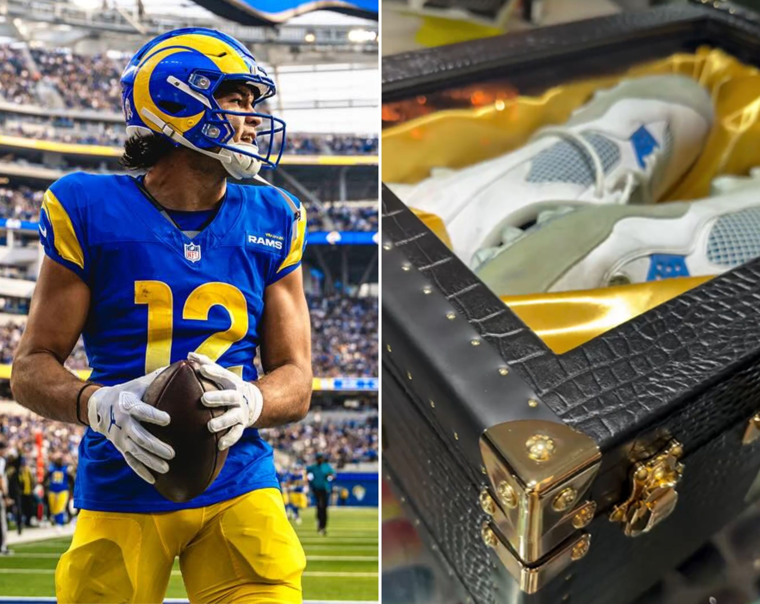 Um acessório nada simples para guardar calçados vem chamando a atenção no mundo da NFL. Puka Nacua, estrela do Los Angeles Rams, aparecerá nos próximos jogos com um estojo feito com exclusividade para suas chuteiras. A caixa, confeccionada em couro de crocodilo e detalhes em ouro, está avaliada em US$ 4 mil (R$ 21,6 mil, na cotação atual).