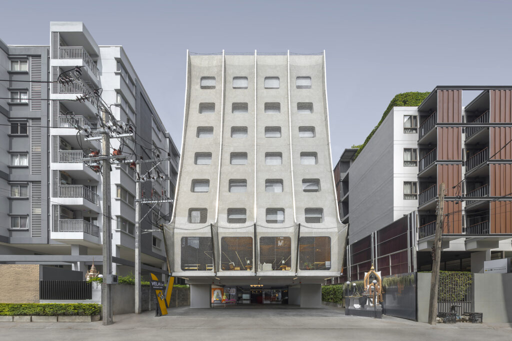 Descrição enviada pela equipe de projeto. Um novo hotel abriu recentemente no vibrante centro de Siam Square, em Bangkok — um bairro conhecido por sua rica cultura e atmosfera animada. A fachada marcante combina motivos tradicionais da arquitetura tailandesa com um toque moderno. Um elemento central é o Pun-Lom, um entalhe detalhado comum em casas clássicas tailandesas, símbolo da herança local. O exterior também é decorado com correntes de aço inoxidável brilhantes, que representam as redes mosquiteiras usadas tradicionalmente nas camas, criando um diálogo entre passado e presente.