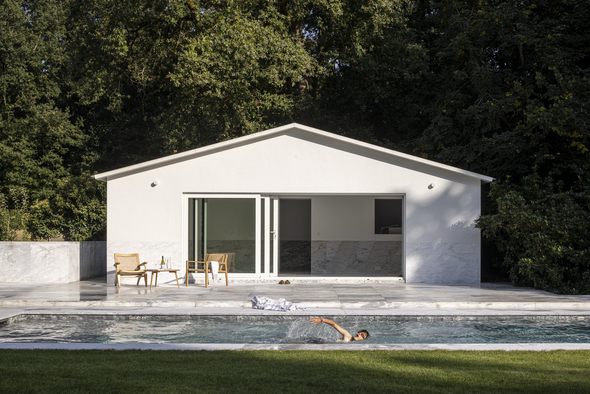 Todo o mármore é extraído, cortado e tratado em Portugal: mármore cinzento para o interior da piscina, e mármore branco para o terraço, socos, lambris e mobiliário fixo. A cabana recorta uma silhueta muito vincada do fundo verde-escuro; a piscina vê-se como um espelho azul-esverdeado.