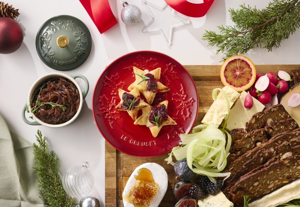 A paleta segue o imaginário tradicional do feriado, com peças em Vermelho, Branco e Thyme, um tom de verde recentemente introduzido pela Le Creuset. Esses três tons, usados separadamente ou combinados, reforçam a identidade da coleção e dialogam com arranjos, toalhas, guardanapos e outros elementos típicos da ceia. Para complementar essa estética, os itens trazem relevos de folhas de azevinho, um dos símbolos mais reconhecidos do Natal em diferentes culturas. Em alguns produtos, essa referência é combinada a formatos temáticos, como estrela e árvore de Natal.